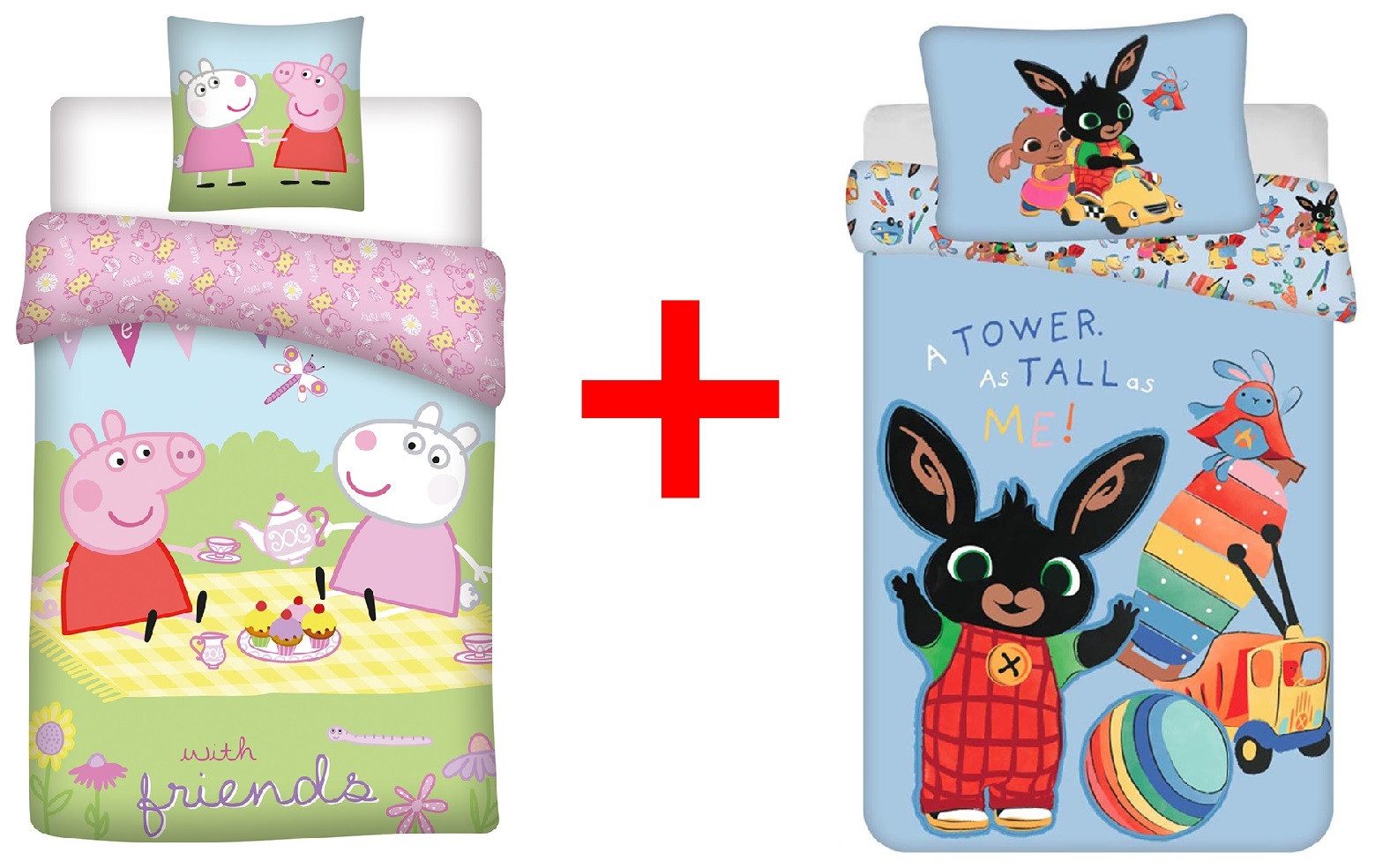 Marke: Disney Charakter: Bettwäsche-Sets Motiv: Peppa Wutz und Bing Bunny Farbe: mehrfarbig Размер Bettdecken-Bezug: 100 x 135 cm Размер Kopfkissen-Bezug: 40 x 60 cm Material: 100% Baumwolle Lieferumfang: 2 x Bettwäsche-Sets