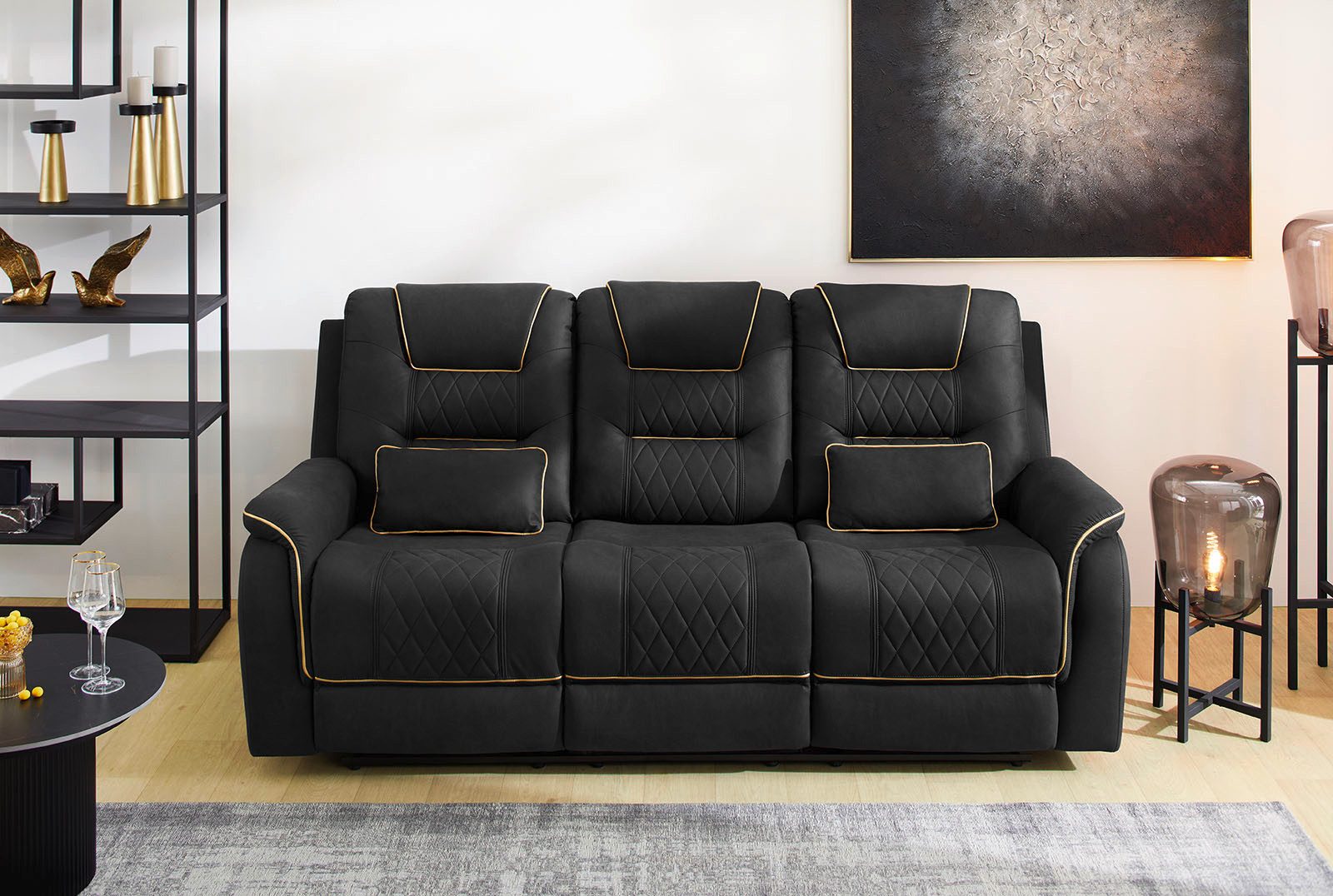 Wissenswertes | Das komfortable 3-Sitzer-Sofa ist in den beiden äußeren Sitzeinheiten mit einer gemütlichen, halbautomatischen Relaxfunktion ausgestattet. Diese Funktionsstarthilfe wird mit dem Bedienelement in der Armlehne ausgelöst. Die Besonderheit dieser Funktionseigenschaft liegt in dem praktischen „Wall-Free-Beschlag“, bei dem das 3-er Sofa trotz Verstellung sehr nah an der Wand stehen kann, ohne dass die Funktion eingeschränkt ist.Neber einer modernen Rautensteppung im Sitz- und Rückenbereich ist das 3-er Sofa zusätzlich mit goldfarbenen Applikationen ausgestattet, sodass ein Hauch von Luxus im Wohnbereich schwebt.Der äußerst komfortable Sitzkomfort wird durch die Kombination von Wellenfedern und einer Tonnentaschenfederkernpolsterung erzielt. |
