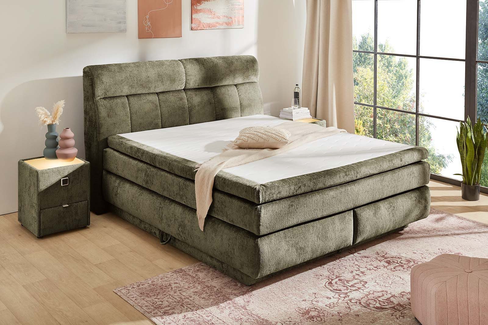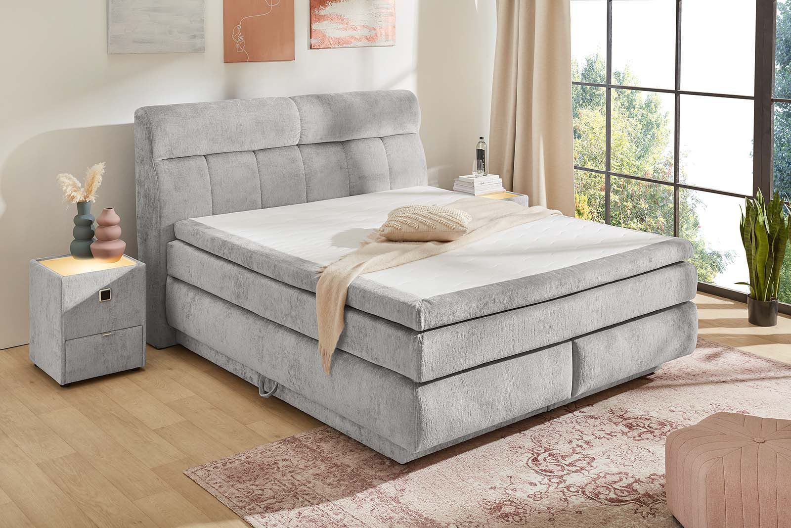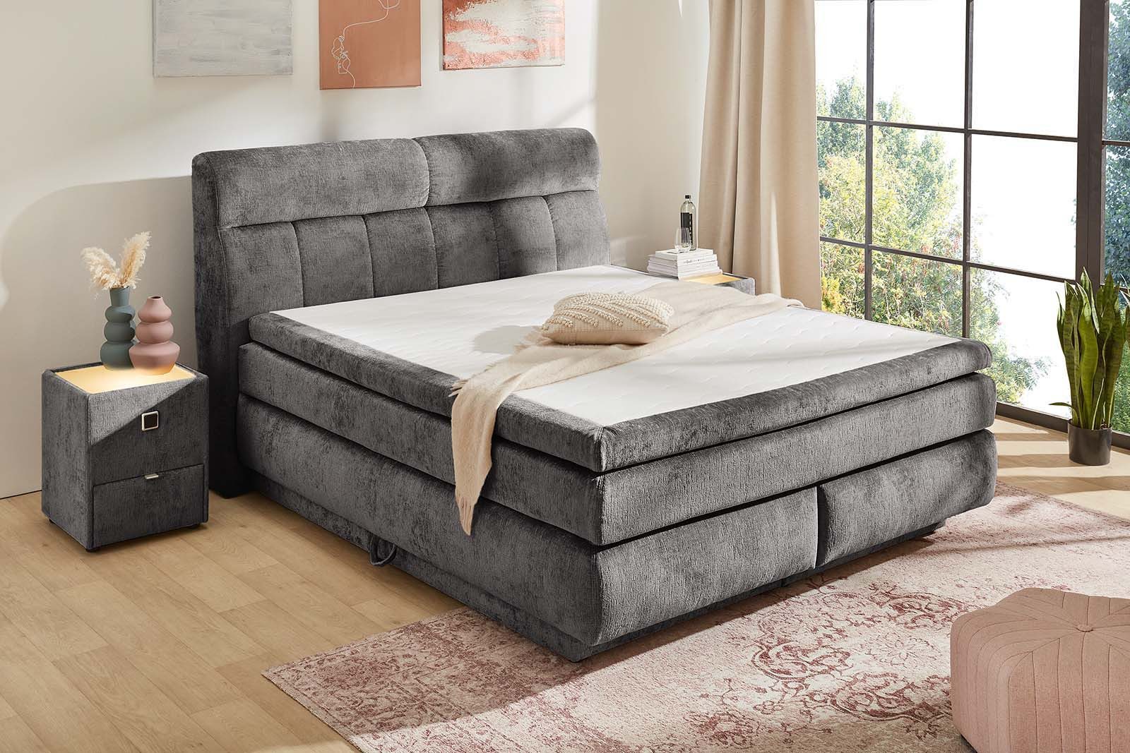 Wissenswertes | Neben dem kraftvollen und dominanten Auftritt punktet das Boxspringbett mit technischen Raffinessen. Zum einen bietet der mittels Gasdruckfedern leichtgängig zu öffnende Stauraum in beiden Boxen genügend Platz für z.B. saisonale Bettwaren. Wie es sich für einen fulminanten Schlafzimmer-Eyecatcher gehört, wurde bei der Aufpolsterung neben Bonell, 7-Zonen-TTFK ein komfortabler 9cm KS-Topper gewählt. Durch die so erzeugte Doppelfederung entsteht ein einmaliger Federkomfort mit optimaler Körperanpassung und Druckentlastung. Den Abschluss eines wunderbaren Schlaferlebnisses bildet der bildet der extra starke Kaltschaum-Topper. Dieses Boxspringsystem ermöglicht einen hervorragenden Schlafkomfort durch sein exzellentes und individuelles Doppelfederungsverhalten. |
