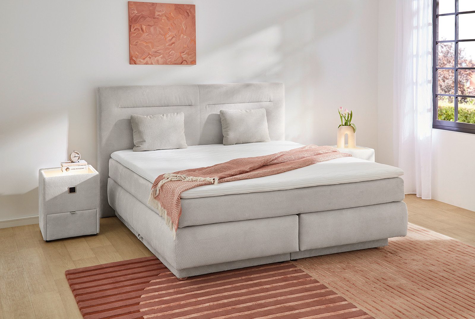 Wissenswertes | Das komfortable Stauraum-Boxspringbett überzeugt gleichermaßen mit einem modernen Design und praktischen Details. Auf jeder Bettseite steht ein mehr als großzügiger Stauraum für Kissen oder Decken zur Verfügung. Für ein leichtgängiges Öffnen und Спрятать werden Gasruckfedern eingesetzt, sodass der Bettkasten/Stauraum ohne großen Kraftaufwand genutzt werden kann. Auch beim Liegekomfort stehen praktikable Eigenschaften im Vordergrund. Auf einer Box mit Bonell-Federkernpolsterung, die als Unterfederung dient, werden H2/H3 Wendematratzen mit einem Tandembezug eingesetzt, welcher ein gegenseitiges Verschieben der einzelnen Matratzen verhindert. Durch die Wendematratzen kann der Härtegrad je nach Bedarf und Bettseite flexibel gewählt werden. Durch die so erzeugte Doppelfederung entsteht ein einmaliger Federkomfort mit optimaler Körperanpassung und Druckentlastung. Den Abschluss für ein erholsames Schlaferlebnisses bildet der PU-Schaum-Topper.Verhindert zum einen ein gegenseitiges Verschieben/Verrutschen der Matratzen. Zudem wird dadurch eine harmonische Optik erzielt. |