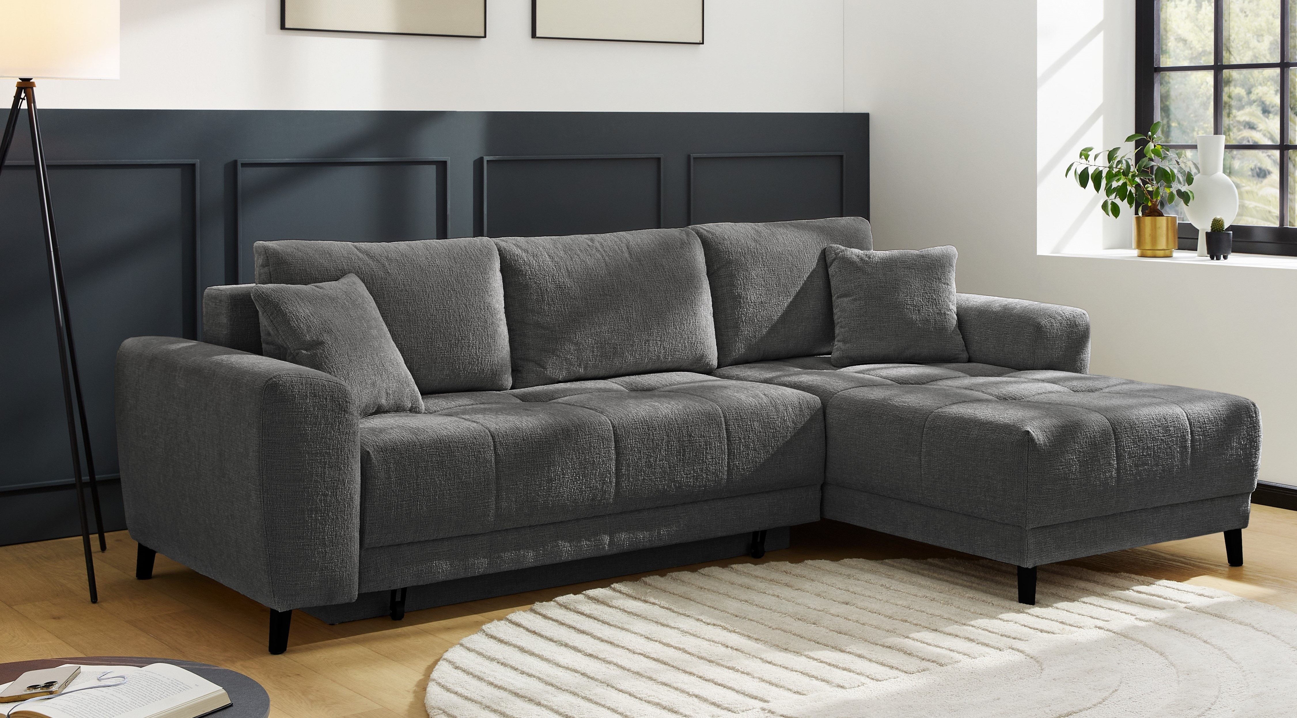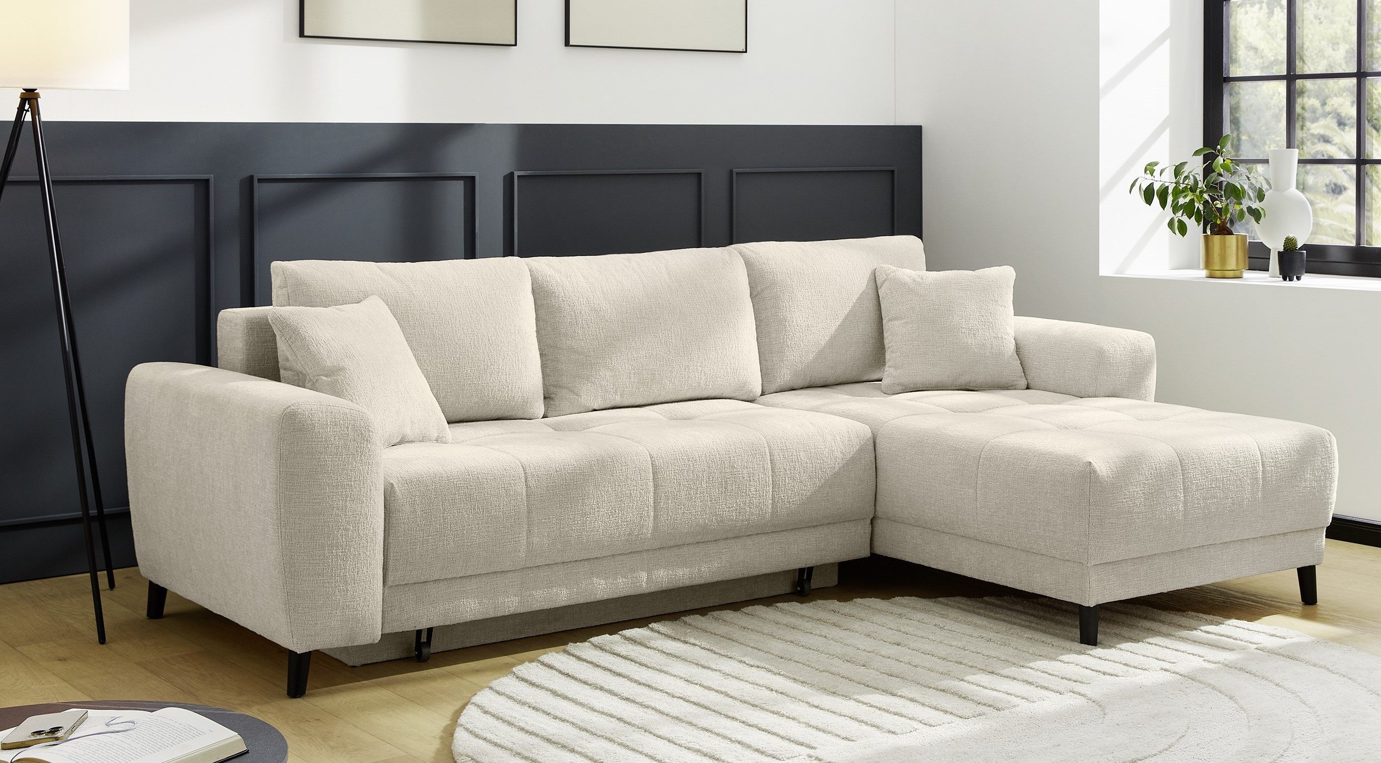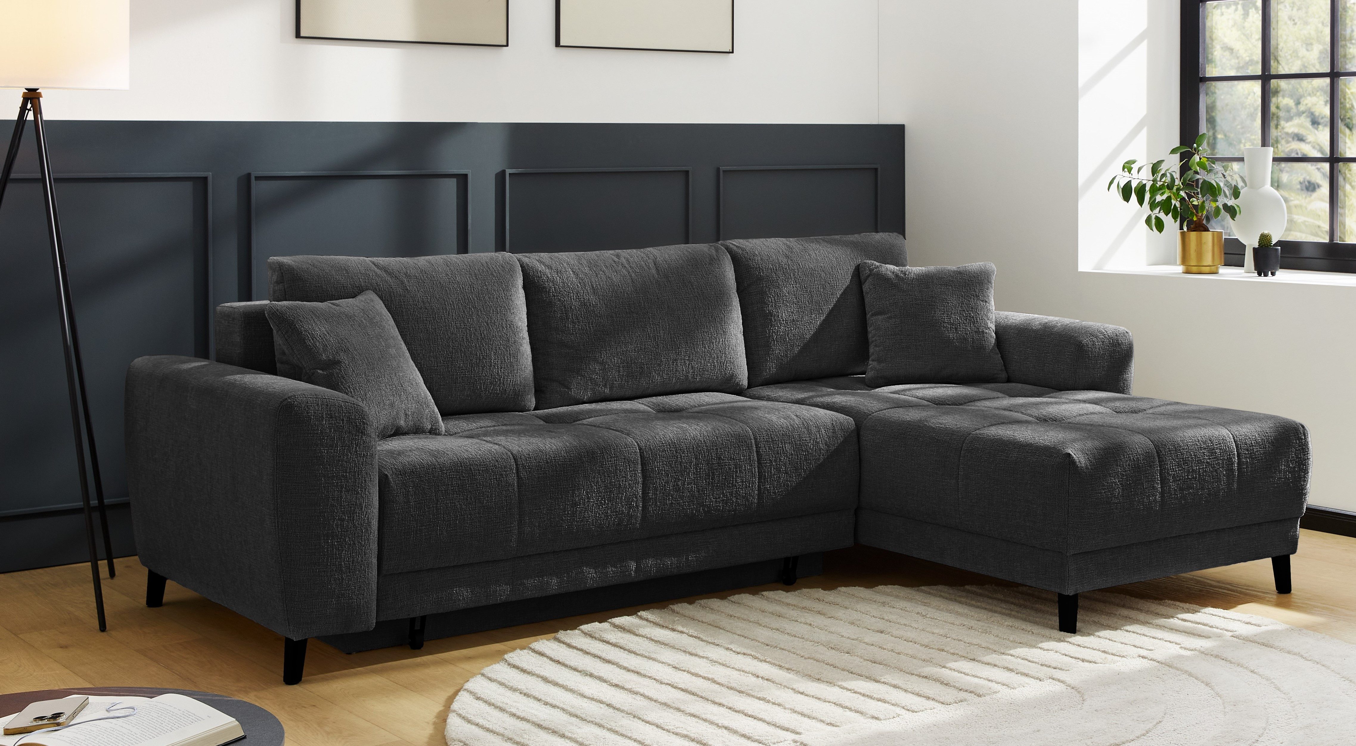 Wissenswertes | Formschönes Ecksofa mit vielen nützlichen Funktionen. Neben einer komfortablen Schlaffunktion, steht ein geräumiger Bettkasten zum Verstauen von Decken, Kissen, … zur Verfügung. Für noch mehr Flexibilität kann die Ottomane wahlweise links oder rechts montiert werden. Insgesamt gehören 3 Rückenkissen und 2 Zierkissen zum Lieferumfang. Die Schaumpolsterung sorgt zudem für einen guten Sitz- und Liegekomfort. Durch den mit Echtstoff bezogenen Rücken, kann die Wohnlandschaft auch „frei im Raum“ gestellt werden. Die schwarzen Metallfüße fügen sich harmonisch ins Gesamtbild ein. |