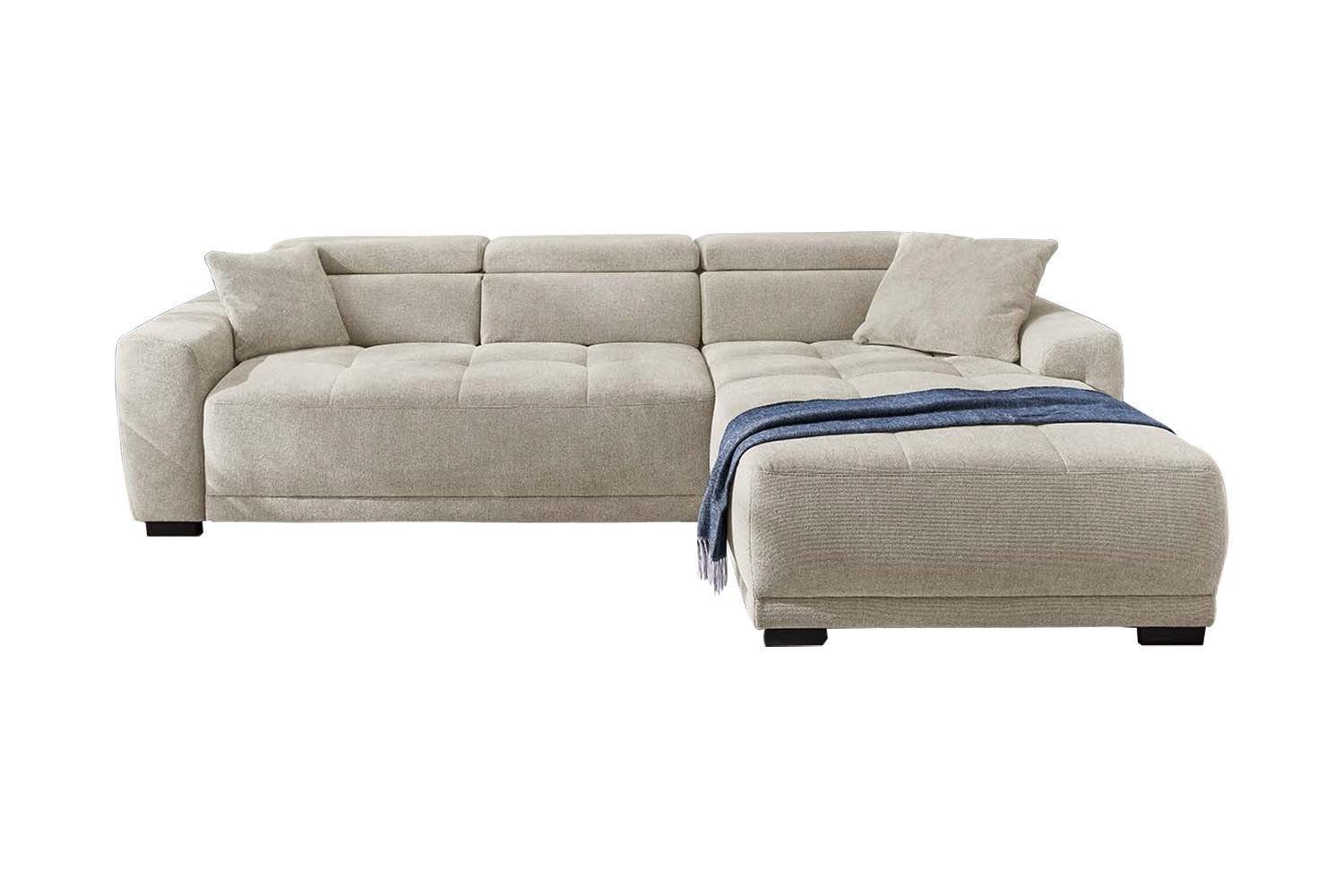 Lieferumfang | 1 Ecksofa mit beidseitig montierbarer Ottomane, 3 Kopfteilverstellungen, elektrischer Sitztiefenverstellung und 2 Zierkissen |
