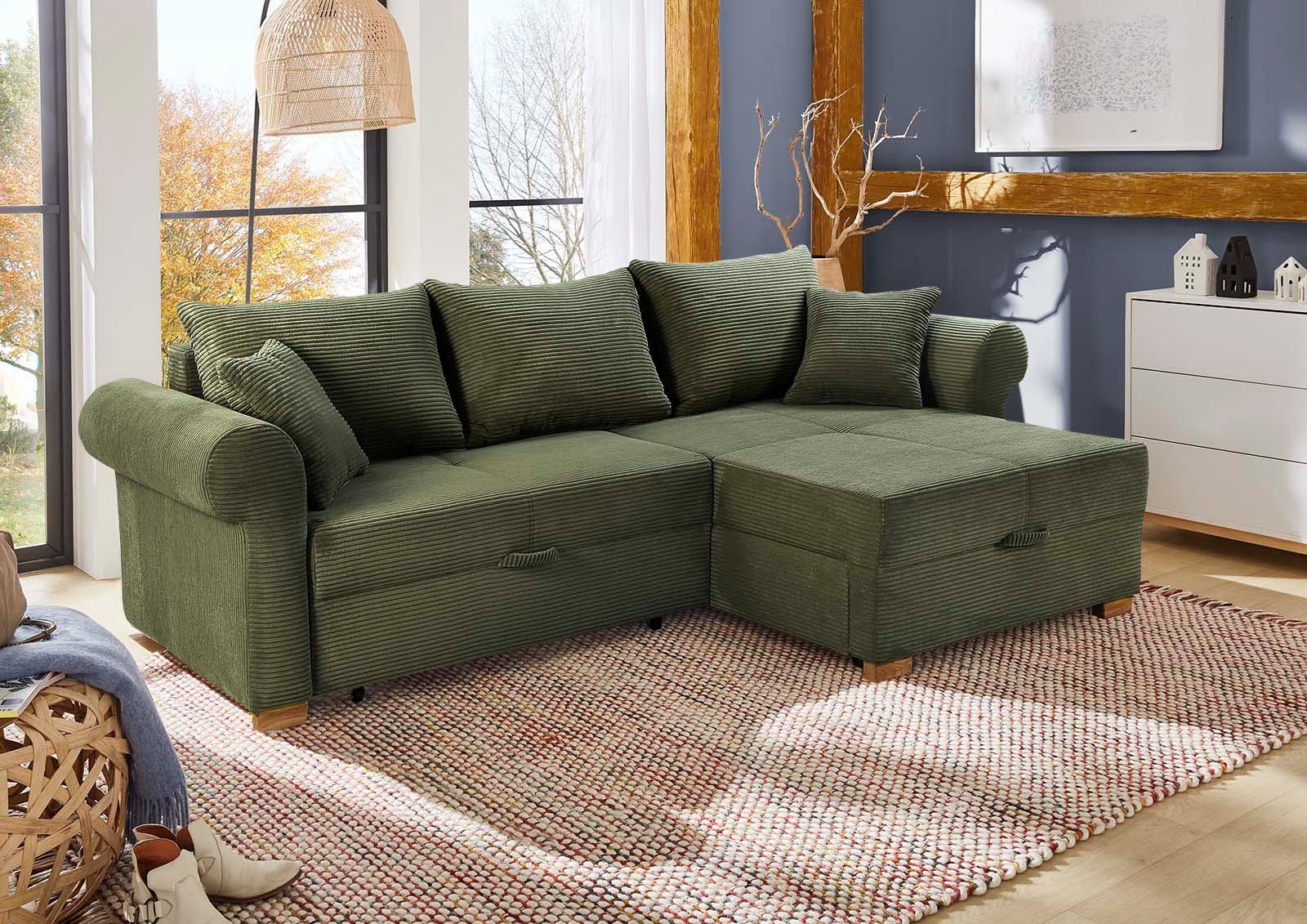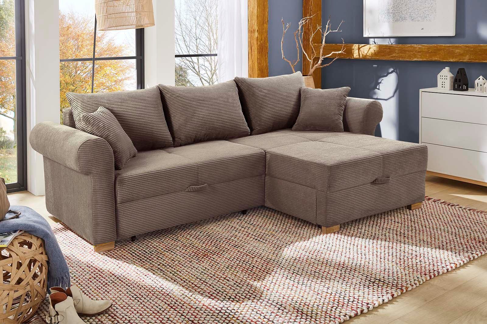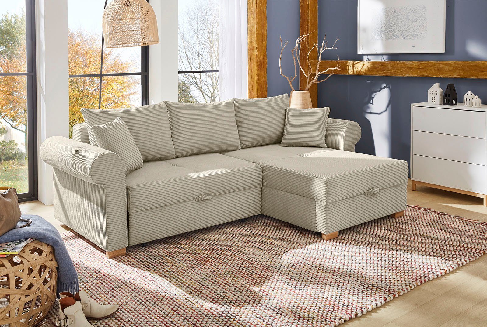 Versehen mit einer ausziehbaren Liegefläche kann dieses Ecksofa »List L-Form« von Jockenhöfer Gruppe ein separates Gästebett ersetzen und somit Platz einsparen. Ein weiterer Vorteil ist das passende Rückenkissen, das nicht nur ein schönes Deko-Element ist, sondern auch für noch mehr Komfort sorgt. Die Ottomane kann entweder auf der linken oder auf rechten Seite angebracht werden. Aus Holz gefertigt, bestechen die eichefarbenen Füße durch eine unverwechselbare Optik.