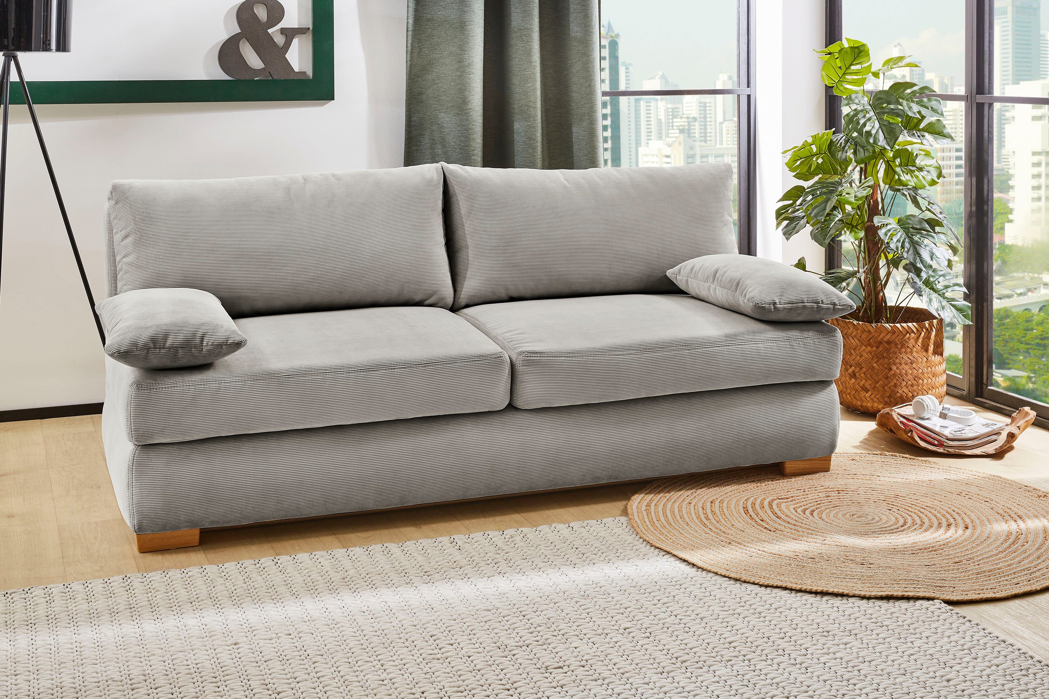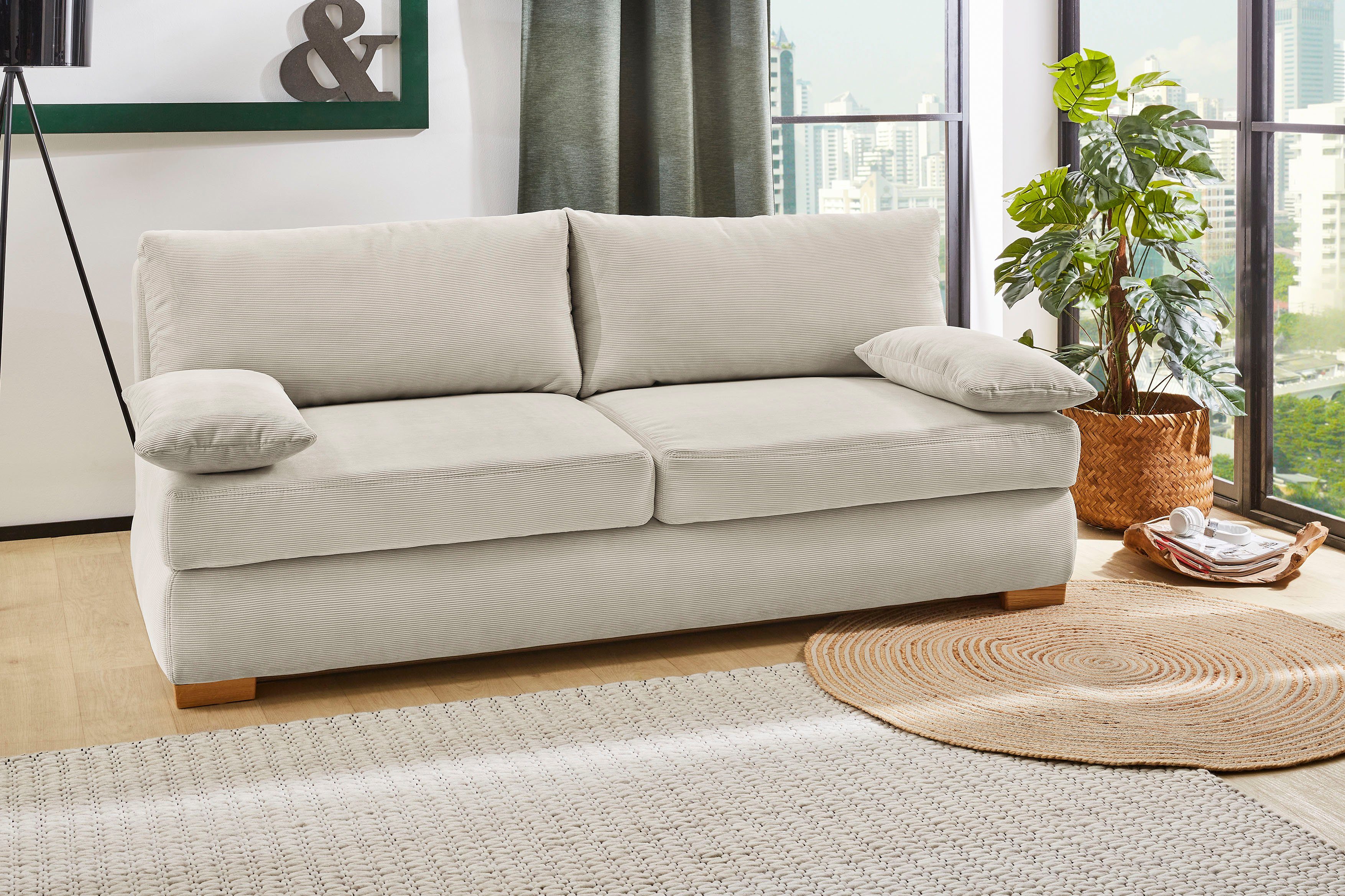 Eine elastische und formbeständige Sitzoberfläche bekommst du mit diesem Schlafsofa »Derby« von Jockenhöfer Gruppe, das mit langlebiger Federkern-Polsterung ausgestattet ist. Außerdem handelt es sich hierbei um ein echtes Platzwunder, da es mit einer ausziehbaren Liegefläche versehen und somit Schlaf- und Ruhezone in einem ist. Was dir auch zu Gute kommt, ist das passende Rückenkissen, das dekorativ und zugleich komfortabel ist. Belastbar ist ein Sitzplatz bis zu 110 Kilogramm. Die buchefarbenen Füße aus hochwertiger Buche sind sehr hart und damit auch belastbar und langlebig.
