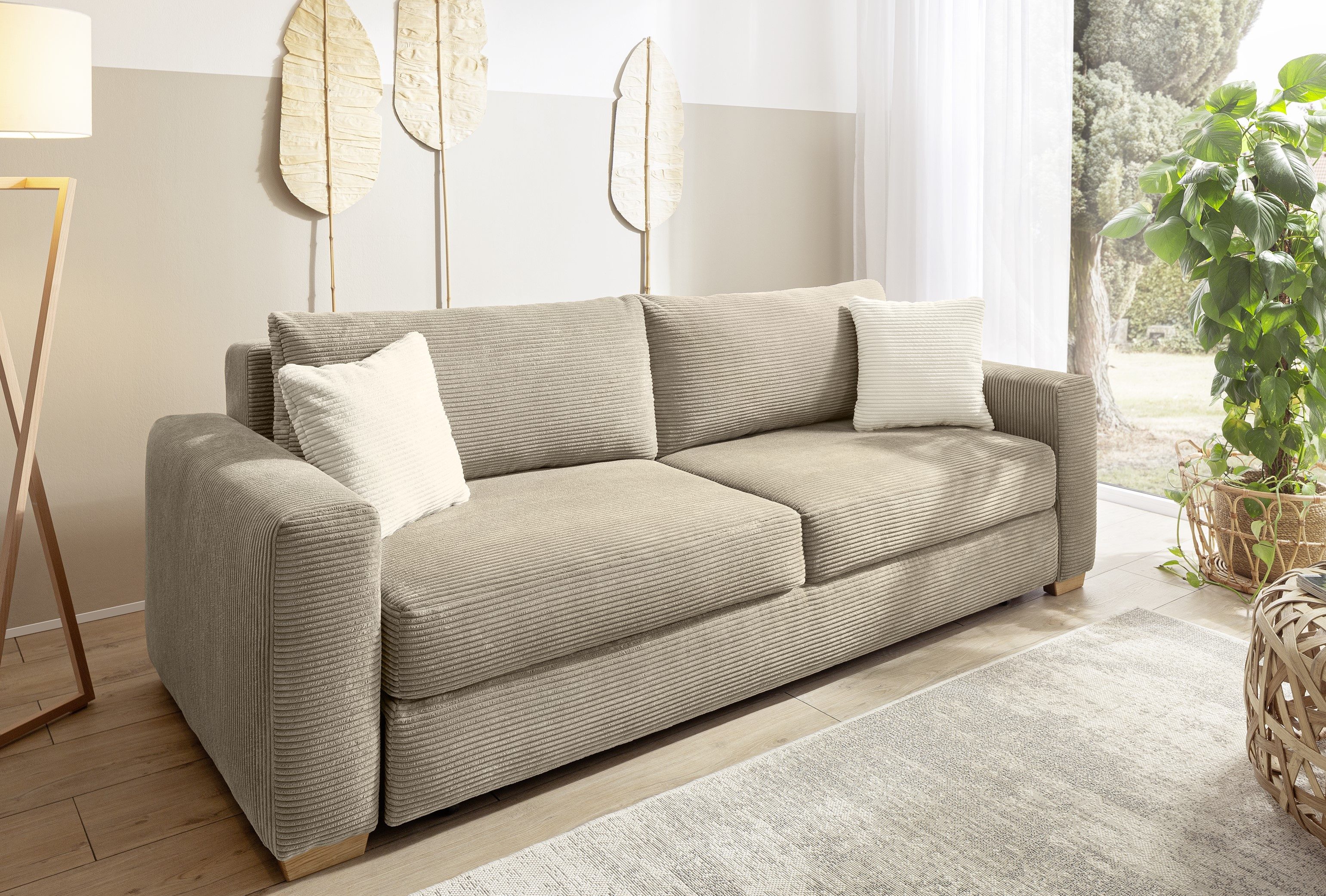 Wissenswertes | Schlafsofa für gehobene Ansprüche. Die gemütliche und hochwertige Federkernpolsterung im Sitz und Rücken lässt keine Wünsche mehr offen. Ganz egal ob Chillen, Sitzen, Relaxen, oder alles gleichzeitig. Auch an den Übernachtungsbesuch wurde gedacht, indem durch einfaches Vorziehen der Sitzfläche und Umklappen des Rückenelementes eine großzügige Liegefläche entsteht. 2 Rückenkissen und 2 Zierkissen gehören immer dazu. Die massiven Echtholzfüße in Eiche fügen sich harmonisch ins Gesamtbild ein. Der integrierte Bettkasten bietet ausreichend Stauraum. Der Rücken ist mit Echtstoff bezogen. |