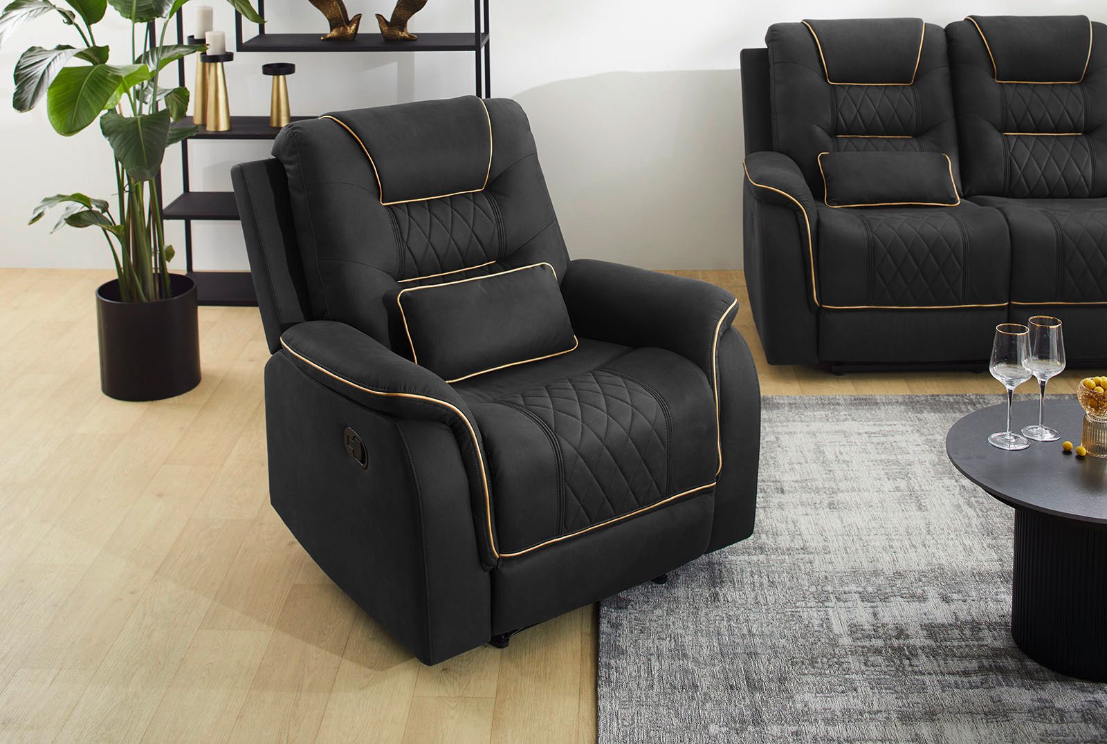 Wissenswertes | Der komfortable Fernsehsessel ist mit einer gemütlichen, halbautomatischen Relaxfunktion ausgestattet. Diese Funktionsstarthilfe wird mit dem Bedienelement in der Armlehne ausgelöst.Die Besonderheit dieser Funktionseigenschaft liegt in dem praktischen „Wall-Free-Beschlag“, bei dem der Sessel trotz Verstellung sehr nah an der Wand stehen kann, ohne dass die Funktion eingeschränkt ist.Neber einer modernen Rautensteppung im Sitz- und Rückenbereich ist der Sessel zusätzlich mit goldfarbenen Applikationen ausgestattet, sodass ein Hauch von Luxus im Wohnbereich schwebt.Der äußerst komfortable Sitzkomfort wird durch die Kombination von Wellenfedern und einer Tonnentaschenfederkernpolsterung erzielt. |