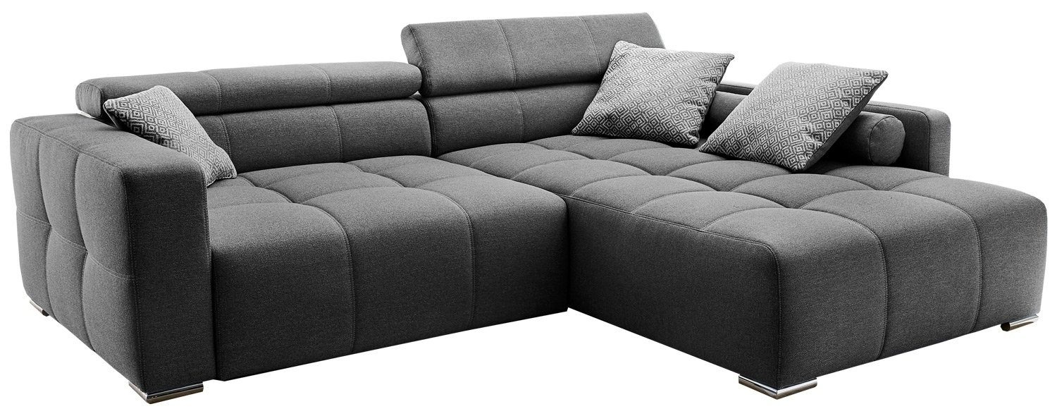 Lieferumfang | 1 Ecksofa mit 2 verstellbaren Kopfstützen, 2 Rollen-, 2 Wende- und 1 Zierkissen. Die Ottomane ist beidseitig montierbar |