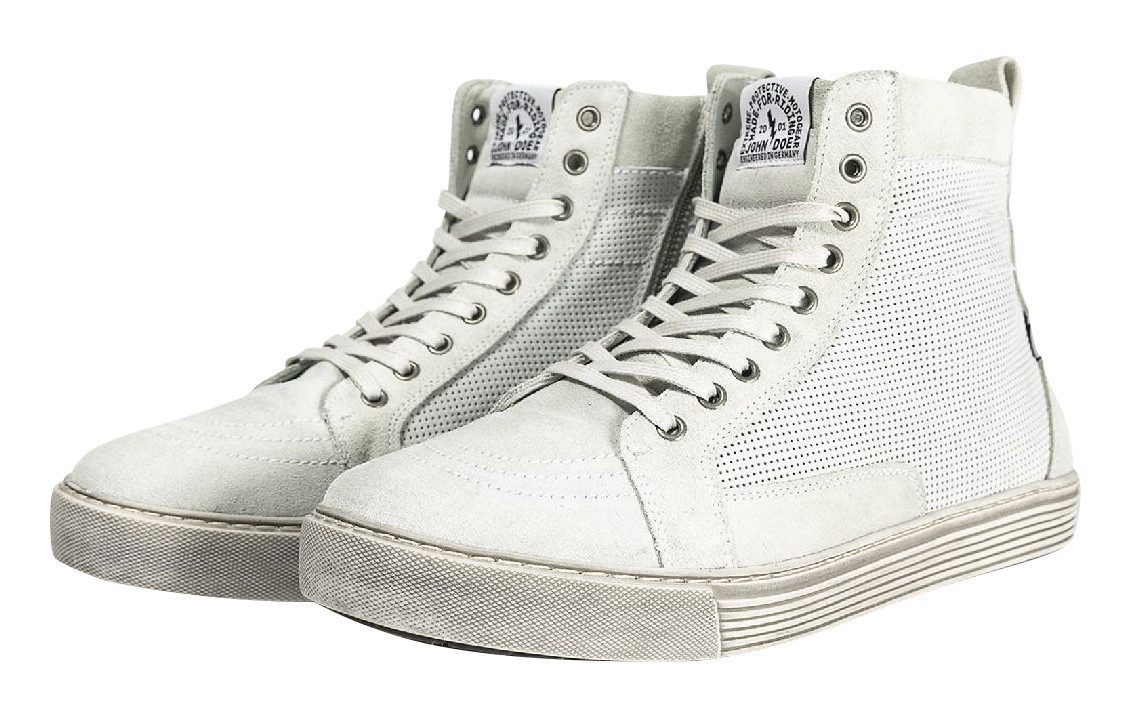 John Doe ist bekannt für ihre hochwertigen Motorrad Hemden, Hosen oder Jacken. Nach intensiver Entwicklungszeit sind nun die Motorrad Sneakers aus dem Hause John Doe auf dem Markt gekommen. Diese Motorradschuhe garantieren höchste Funktionalität bei Extrembelastungen. Hierfür wurde neben dem echten Rindsleder, Kanvas Twill auch eine extra Schutz-Schicht der XTM Fiber Membran verarbeitet. Dadurch ist eine noch stärkere Schutzfunktion und ein stärkerer Abriebschutz geschaffen, als es bei gewöhnlichen Motorrad Lederschuhen der Fall ist. Des Впередen sorgt die John Doe Threepoint-Protection, eine Verstärkung am Knöchel, Ferse und Vorderfuß, für weiteren Schutz der Füße. Die atmungsaktiven John Doe Motorradstiefel sind wasserabweisend und super atmungsaktiv. Endlich kann man auf dem Motorrad sein und die Füße können auch in echten Motorradschuhen atmen. Sehr praktisch ist die Funktion Easy Entry, durch den YKK Reißverschluss kann man den Schuh schnell An- und Ausziehen ohne dabei den Schuh aufzuschnüren. Die Schuhsohle ist Öl resistent, vibrationsabsorbierend und besonders rutschfest, damit man mit den John Doe Bikerschuhen immer einen festen Halt hat. Die Schuhe sind natürlich geprüft und wurden in Portugal handgefertigt. John Doe hat bei diesem Bike Sportschuhen die Liebe zum klassischen Sneakers Look angesetzt Die John Doe Flag ziert die Seite des Motorradschuhes. Ein perfekter Motorradschuh mit dem Namen Neo von John Doe.