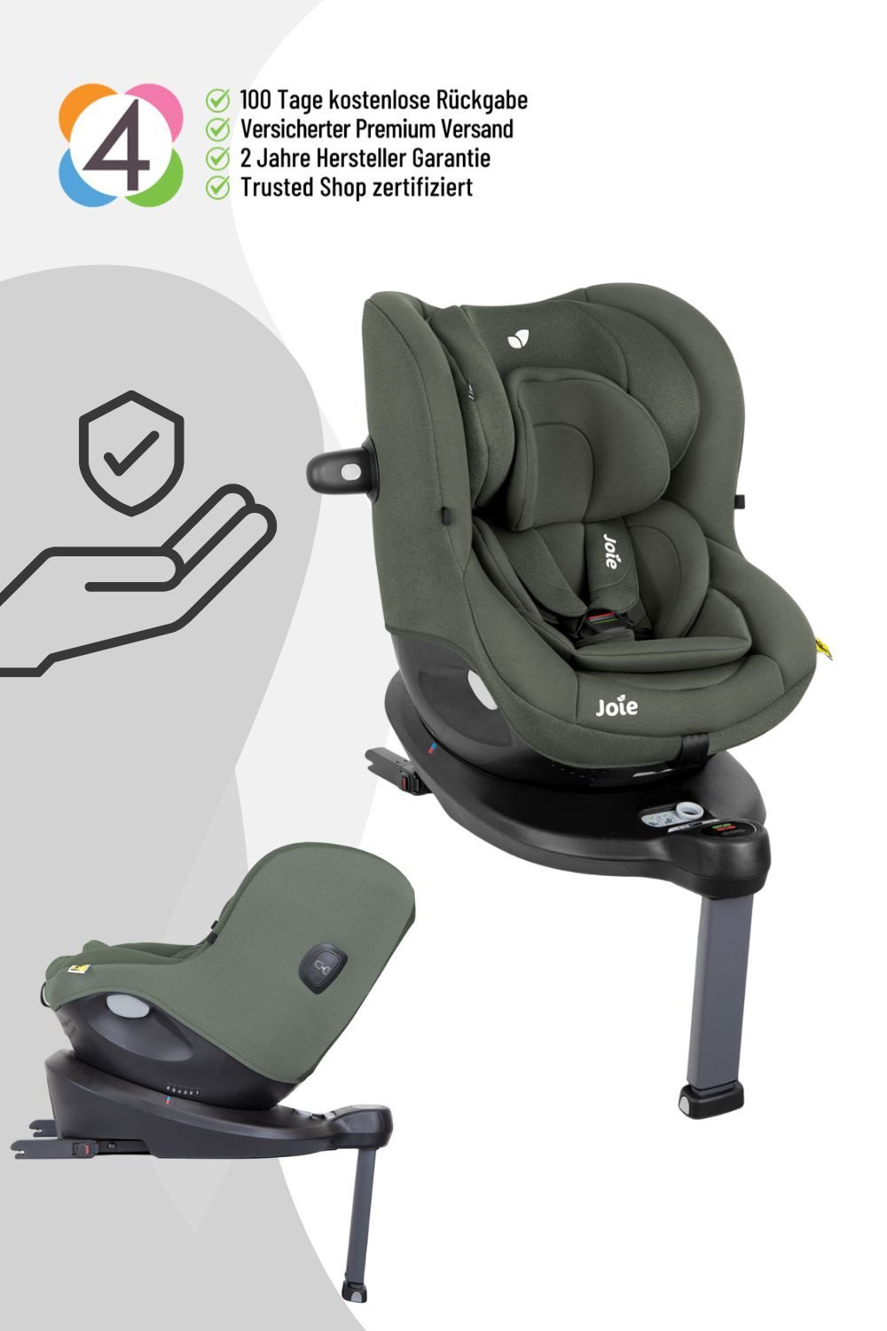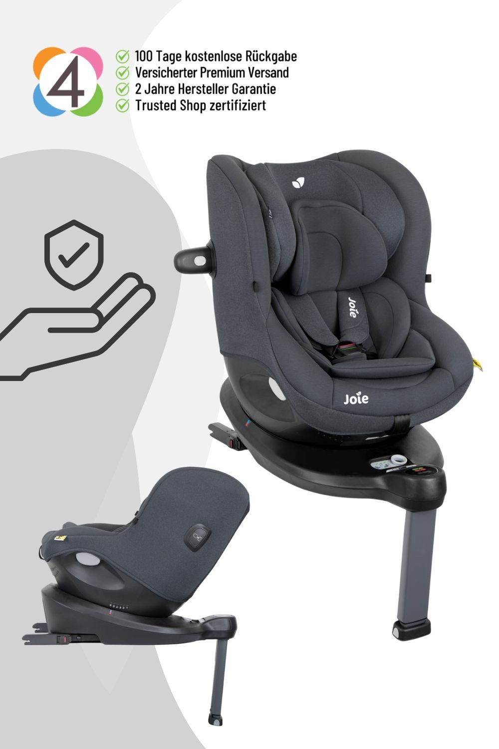 Der Joie i-Spin 360 i-Size ist ein Reboarder-Kindersitz, der Babys ab Geburt sicher und komfortabel rückwärtsgerichtet transportiert. Er erfüllt die i-Size-Sicherheitsstandards und kann ab einer Körpergröße von 76 cm (ca. 15 Monate) auch vorwärtsgerichtet genutzt werden. Die Isofix-Basis mit Standfuß sorgt für eine stabile Befestigung, während die 360°-Drehfunktion das Ein- und Aussteigen erleichtert.