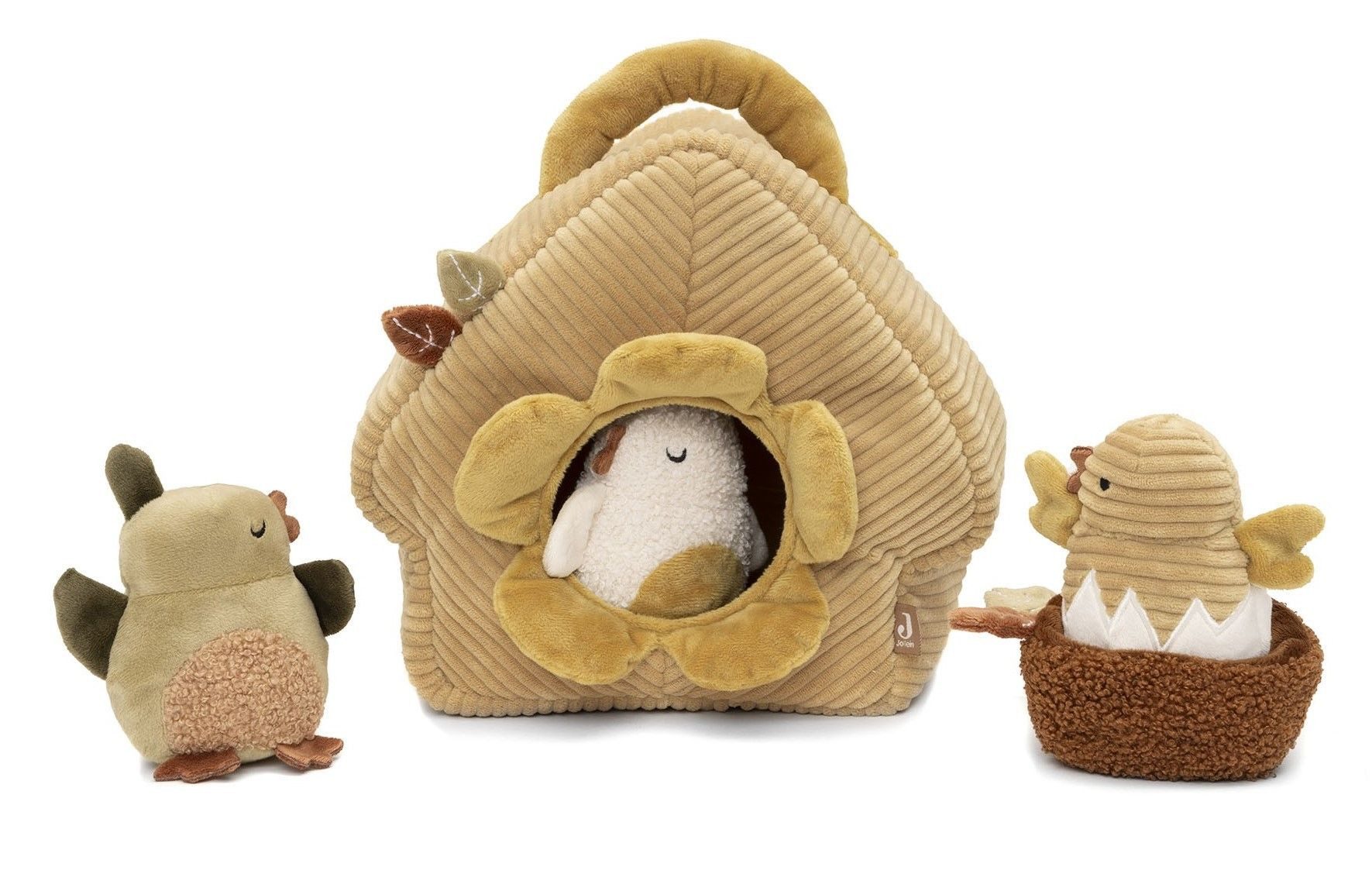 Dieses Set enthält drei niedliche Vögelchen – Lulu, Chirp und Feather – die in einem großen Vogelhaus versteckt werden können. Das Haus ist wunderschön mit Blättern verziert, hat eine verspielte Blumenöffnung und erzeugt ein knisterndes Geräusch für zusätzlichen Spielspaß. Lulu ist eine kleine Entdeckerin, die immer auf der Suche nach neuen Abenteuern ist. Chirp ist ein fröhlicher Sänger, der den ganzen Tag über zwitschert und fröhliche Geräusche macht. Feather ist ein verspieltes Vögelchen, das am liebsten tanzend durch die Lüfte schwebt. Dank des praktischen Henkels können Sie das Vogelhaus überallhin mitnehmen. Ein perfektes (Geburts-)Geschenk für neugierige Minis!