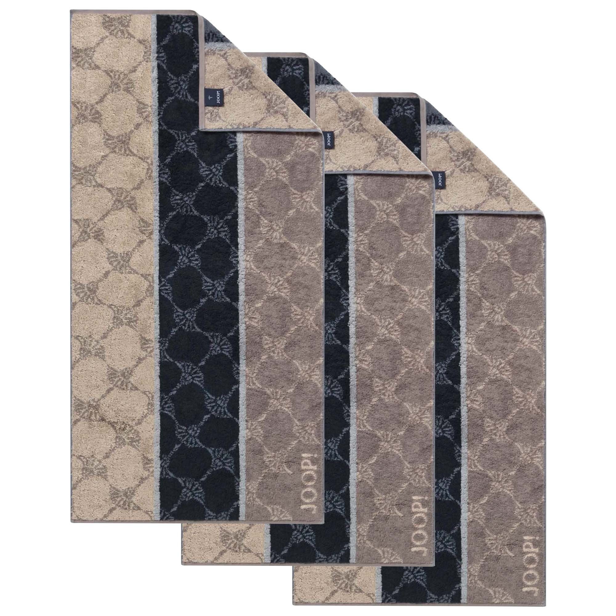 Drei elegante Handtücher von der Marke JOOP!. Aus reiner Baumwolle in flauschiger Walkfrottier-Qualität. Markentypisches Kornblumenmuster in Wende-Optik.