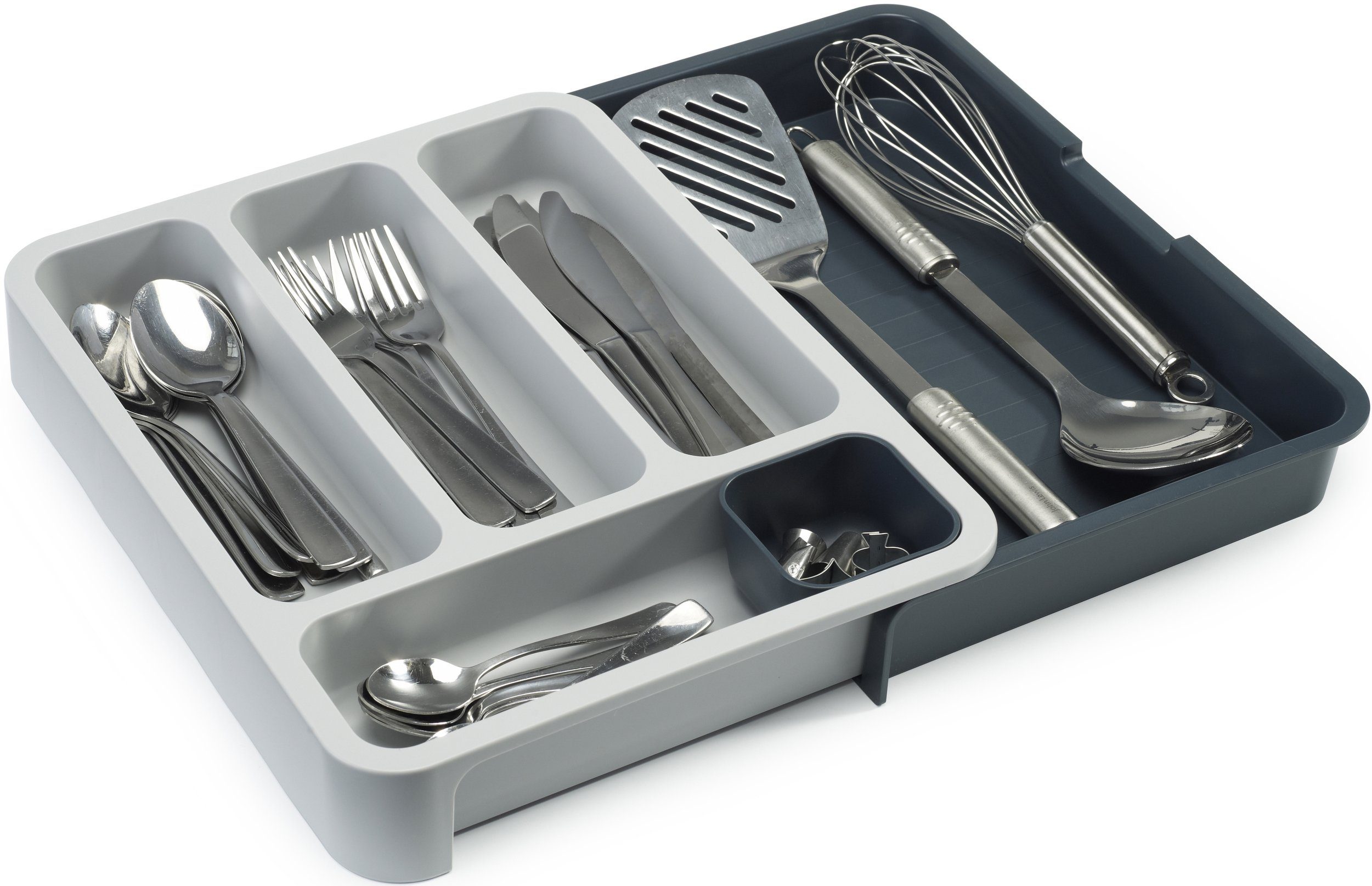 Bringen Sie Ordnung in chaotische Besteckkästen mit dieser praktischen und cleveren Aufbewahrungslösung von Joseph Joseph. Die zwei Besteckkastenhälften lassen sich nicht nur genau anpassen, um in unterschiedlichen Schubladen Platz zu finden, sondern lassen sich zudem noch fest zusammenstecken. Der Einsatz besteht aus zwei tiefen Fächern für Essbesteck, einem Utensilienbereich für Messer oder größere Küchenhelfer sowie einer beliebig platzierbaren Schale für kleine, lose Dinge. Passt in unterschiedliche Schubladengrößen ab 29 cm bis zu 48 cm. Nur von Hand spülen.