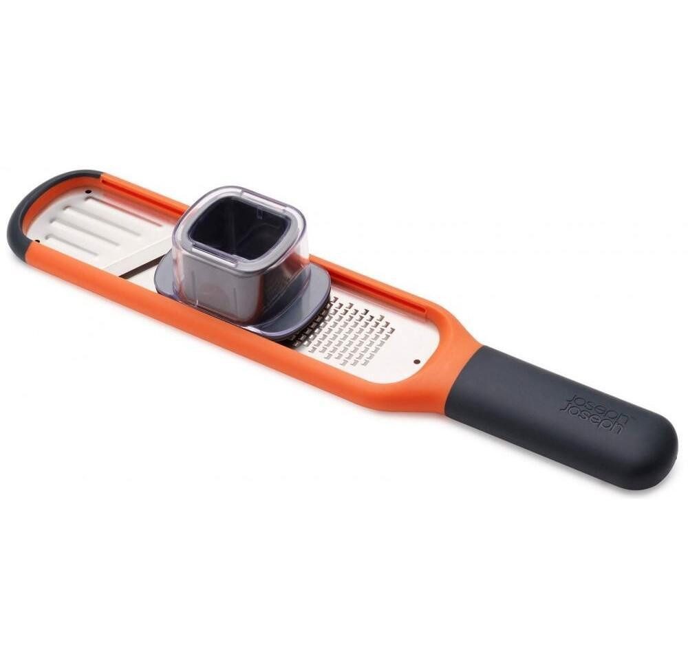 Kompakte Minireibe und -hobel von Joseph Joseph in Orange mit rasiermesserscharfen Klingen für einfaches Reiben und Hobeln von Knoblauch, Ingwer und Radieschen. Ergonomischer Griff, rutschfeste Spitze und beweglicher Fingerschutz sorgen für Sicherheit. Inklusive transparenter Schutzhülle für sichere Aufbewahrung. Spülmaschinengeeignet. Material: Edelstahl, Silikon, Kunststoff. Maße: 29 cm x 6,5 cm x 4,5 cm, Gewicht: 141 g. BPA- und BPS-frei. Perfekt für die platzsparende Aufbewahrung in der Küchenschublade.