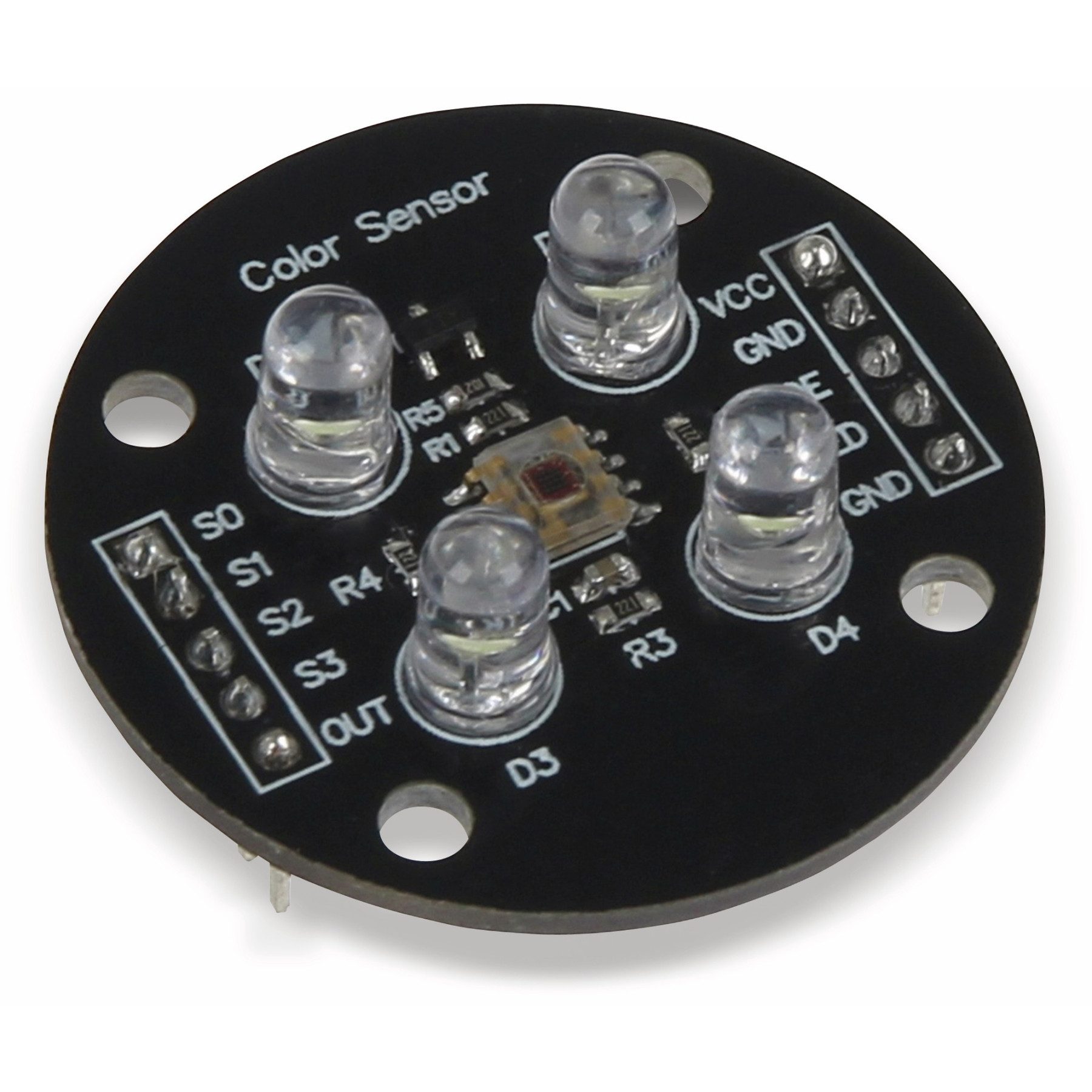 Dieses hochwertige Modul ermöglicht die Rot-, Grün- und Blauanteile von Farben zu bestimmen. Das Herzstück ist der TCS3200 Chip. An den Ausgängen gibt es ein Signal aus, welches in seiner Frequenz in Relation mit der Intensität der gemessenen Farbe gesetzt istDieses Signal kann von Mikrokontrollern mit Echtzeittimern in einen Farbwert umgewandelt werden.Die vier weißen LEDs dienen zur Ausleuchtung der Messung.