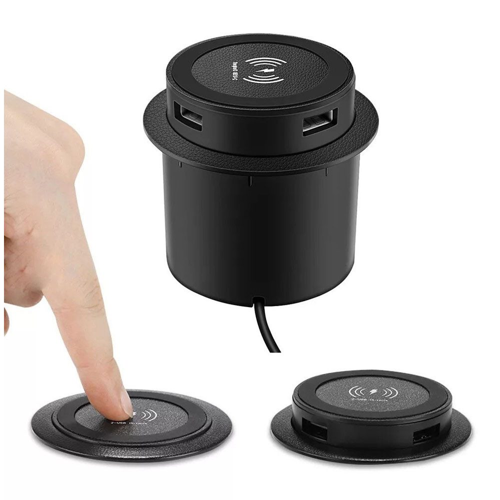Das integrierte kabellose Desktop-Ladegerät ist ein kreisförmiges, unsichtbares Installationsladegerät, das den QI-Standards für das kabellose Laden elektronischer Produkte entspricht. Das Aufsteckladegerät verbirgt 2 USB-Anschlüsse und kann 3 Mobiltelefone gleichzeitig laden.
