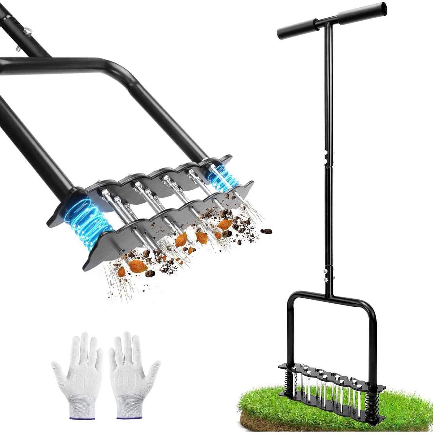 Das Doppelfeder-Design auf beiden Seiten des Rasenbelüfters erspart Ihnen das mühsame manuelle Entfernen von Erde und Schmutz nach der Belüftung. Gartengeräte mit komfortablem T-Griff und gepolstertem Fußpedal ermöglichen eine sanftere und einfachere Belüftung und verbessern Ihre Rasenpflege.