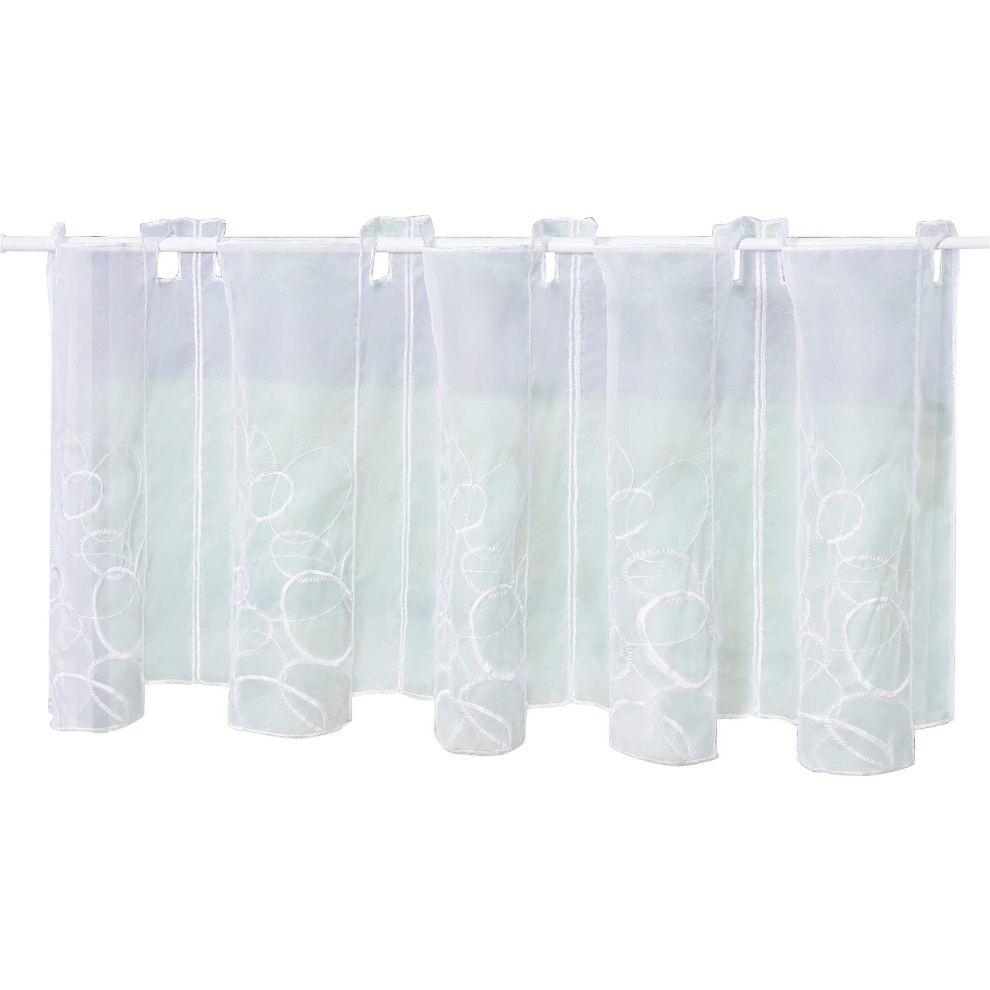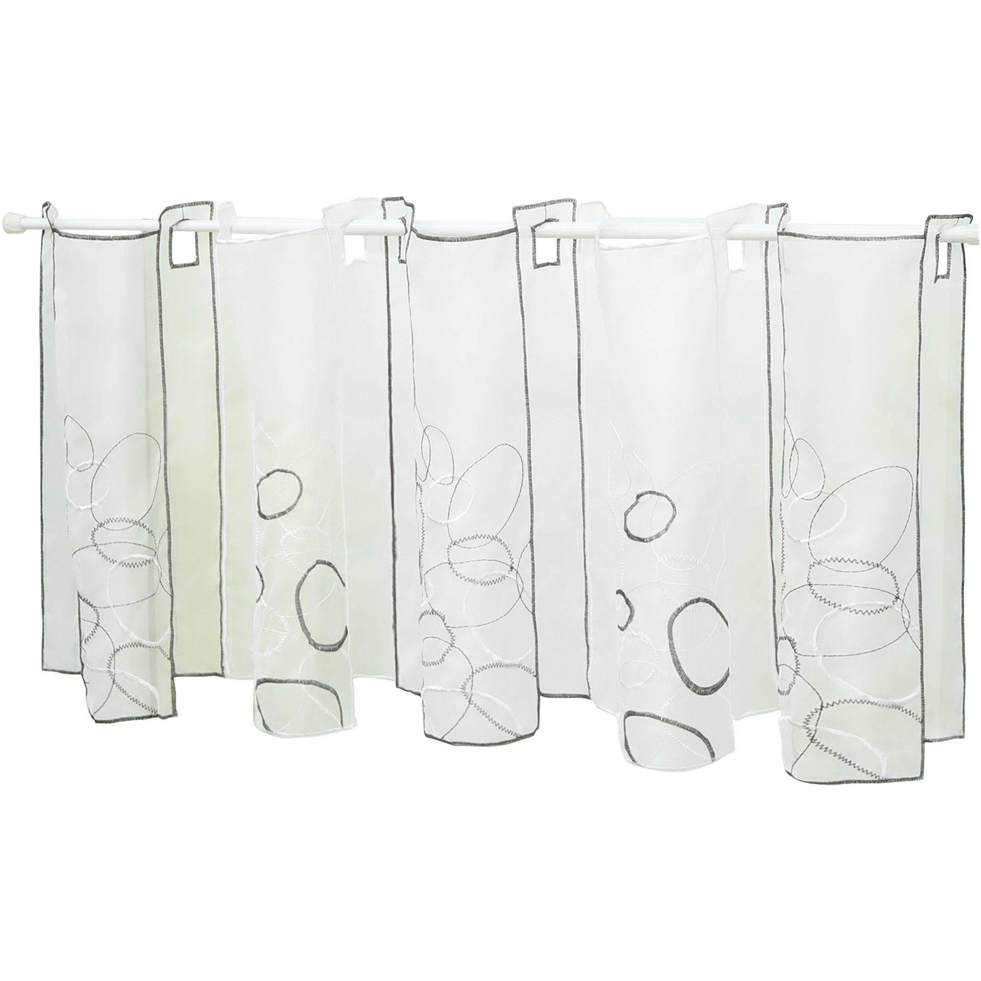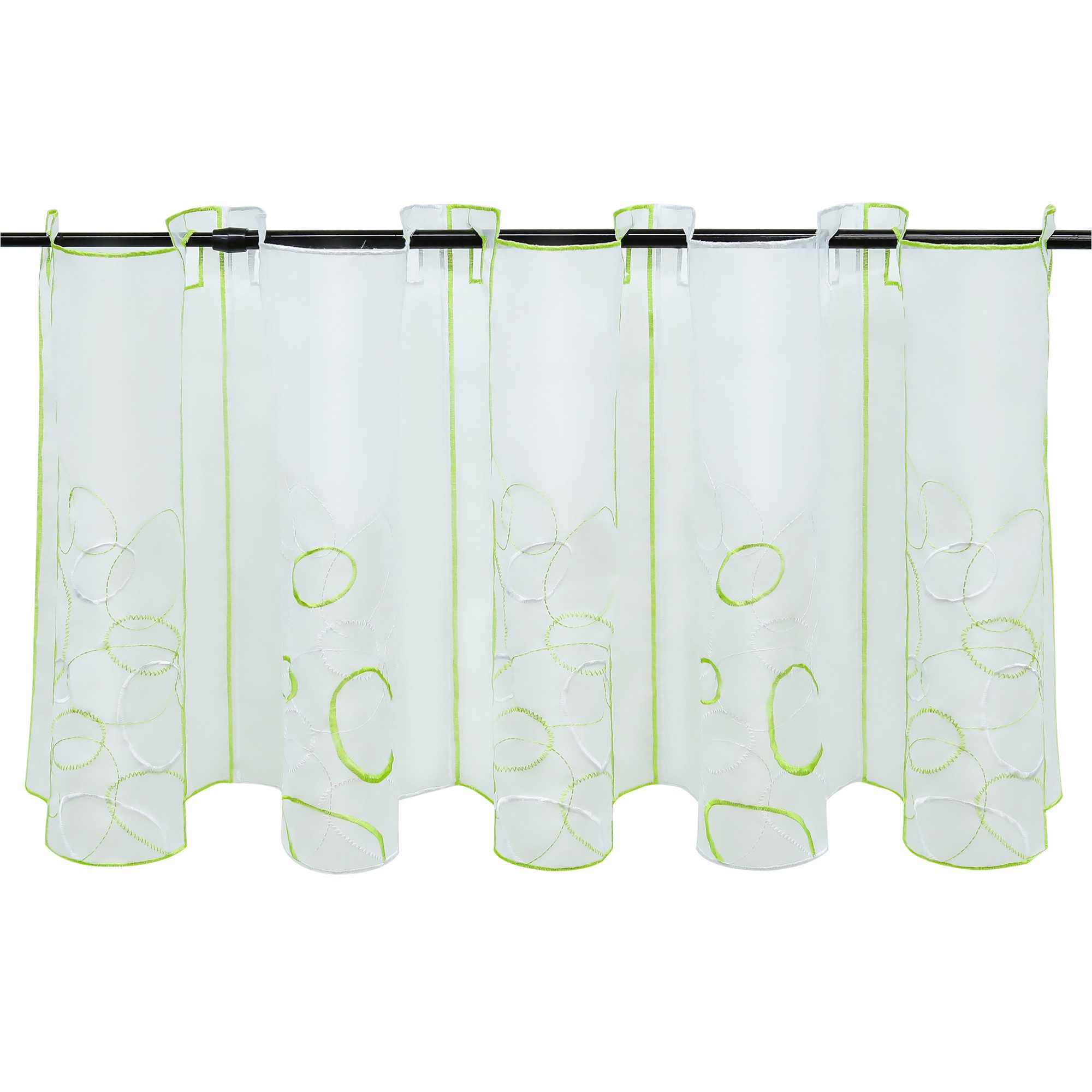 Diese einzigartigen Scheibengardinen bestehen aus mehreren vertikal aneinandergehängten Stoffbahnen mit quadratischen Öffnungen an der Oberseite und weiß-bunten Stickereien an der Unterseite, die mit einer Stickerei eingefasst sind. Ein wunderschönes Gesamtbild. Die lichtdurchlässige Scheibengardine ist aus leichtem Voile gefertigt und macht am Fenster eine tolle Figur, besonders geeignet für kleine Fenster wie z.B. Küchen- oder Kinderzimmerfenster, bei denen lange Gardinen eher unpraktisch sind. Am unteren Rand des Fensters angebracht, schützt sie vor ungewollten Blicken von außen und bietet von innen weiterhin freie Sicht. Es wird eine tolle Alternative, um speziell kleinere Fenster stilvoll zu verschönern. Die angegebenen Maße sind Stoffmaße, Maße sind ca.-Angaben. Es wird beim Ausmessen empfohlen, die Maße der Scheibengardine 1-1,5 fache des Fenstermaßes zu nehmen, so dass das Muster auf der gewellten Gardinen am besten sichtbar. Farbe: grün, weiß, grau Größe: Höhe/Breite: 30/96 cm Höhe/Breite: 30/128 cm Höhe/Breite: 45/96 cm Höhe/Breite: 45/128 cm Höhe/Breite: 60/128 cm Höhe/Breite: 60/144 cm