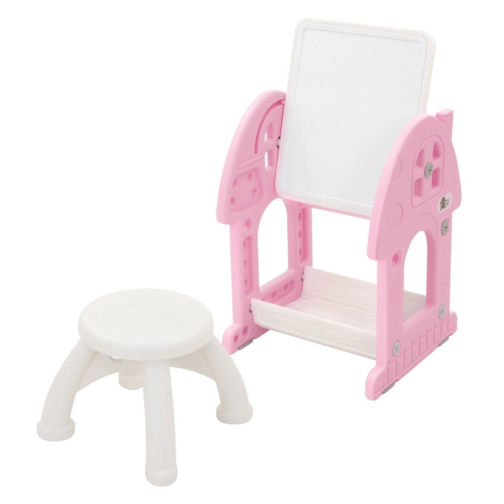Die mitgelieferte magnetische Tafel kann mit Whiteboardstiften bemalt werden und wird ganz einfach umgeklappt, um zur Tischplatte mit Noppen für große Klemmbausteine zu werden. Eine integrierte Ablage sorgt für Ordnung beim Spielen. Der mitgelieferte Hocker ist kindgerecht und stabil, die gesamte Konstruktion besteht aus robustem HDPE- und PP-Kunststoff.