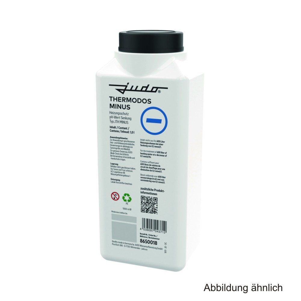 Eigenschaften: JUDO THERMODOS MINUS JTH-MINUS zur pH-Wert-Konditionierung von Warmwasser-Heizungsanlagen. Wirkt sauer, zur schnellen und einfachen Absenkung des pH-Wertes im Heizwasser und Minderung der Korrosionswahrscheinlichkeit nach VDI-Richtlinie 2035. Auch geeignet bei aluminiumhaltigen Werkstoffen. (Herstellerangaben der Komponenten sind zu beachten). Dosierung: Der Flascheninhalt von 1 Liter ist ausreichend für 600 Liter Heizwasser bei einer Absenkung der Alkalität von 0,1 mmol/l. Die erforderliche Dosiermenge ist vorab mit dem JUDO Alkali-Check Messbesteck (Best-Nr. 8690078) unter Berücksichtigung des Systeminhalts zu bestimmen. Die pH-Wertbestimmung des Heizwasser sollte frühestens 8 - 10 Wochen nach Befüllung und bestimmungsgemäßem Betrieb der Heizanlage erfolgen. Die Behandlung ist im Anlagenbuch zu dokumentieren. ACHTUNG: Bei aluminiumhaltigen Werkstoffen soll der pH-Wert 8,2 - 9,0 betragen. Gebindegröße 1 Liter Versandeinheit (Karton) 8 x 1 Liter Modell JTH-MINUS JD8650018