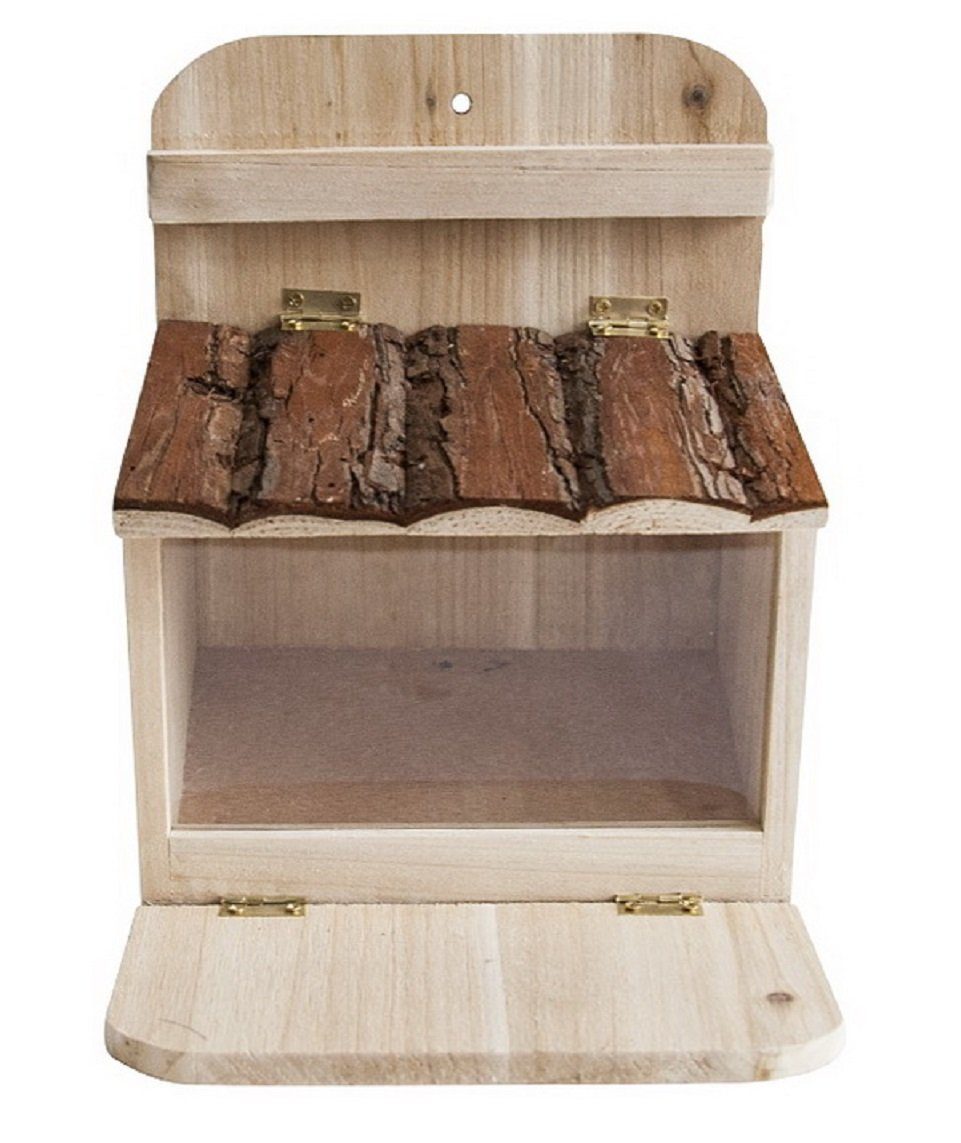 Die Futterstelle kann immer wieder mit Nüssen oder Eicheln befüllt werden. Gesichert durch eine Fensterscheibe, fallen die Nüsse nicht raus. Durch das Rindendach gelangen die Tiere an das Futter.