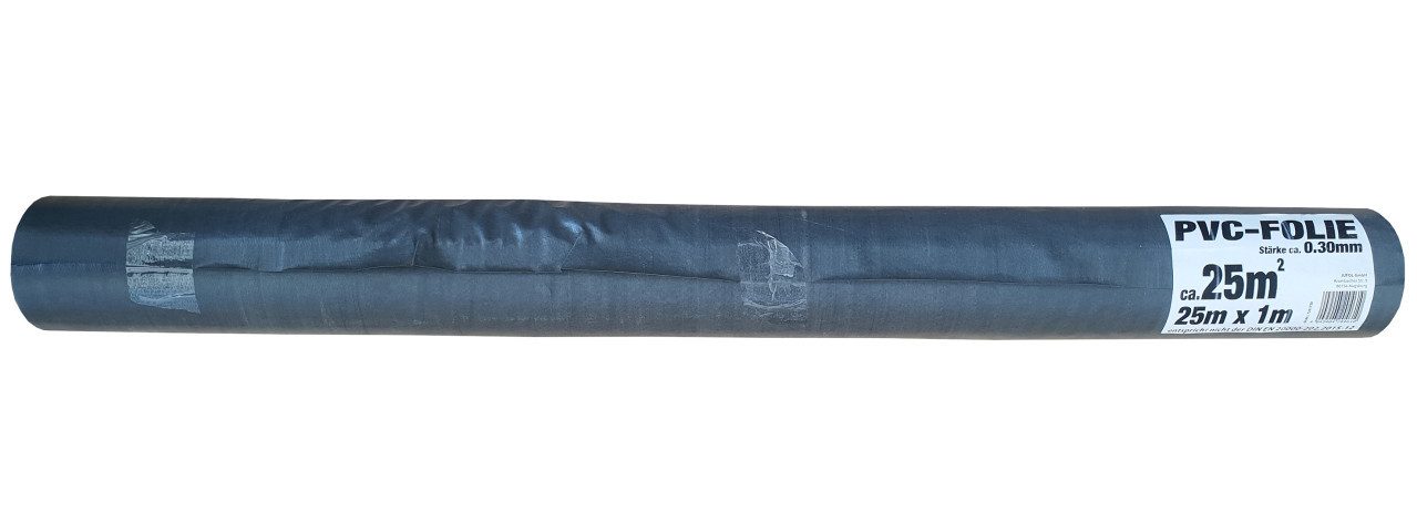 Produktdetails: Einsatzbereich: Innen und Außen | Verlegebereich: Haus, Werkstatt, Baustelle | Farbe: schwarz | Material: Polyvinylchlorid (PVC) | Maß: 25 m x 1 m | Stärke: ca. 0,3 mm | Inhalt: 25 m² | Gewicht: 0,5 kg | Geeignet für: Abdichtungsbahn, Schutzbahn, Flächenfolie | Впередe Eigenschaften: hoch strapazierfähig, nicht bitumenbeständig, auch Heißluft verschweißbar, aus 100% Recyclingmaterial ohne Farbzusätze |