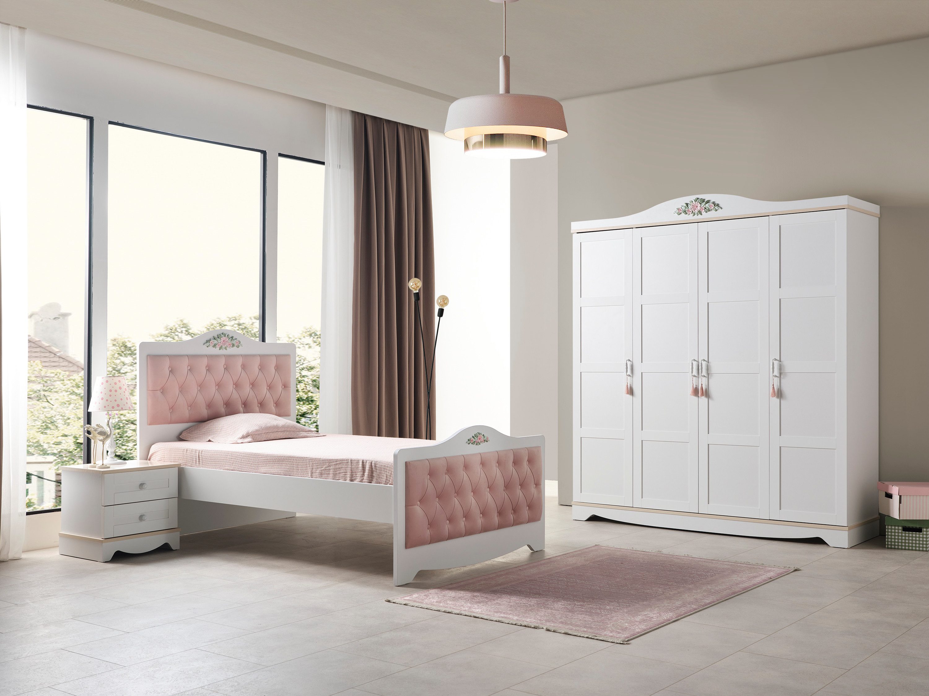 Set beinhaltet | Kleiderschrank (B/T/H): 182/58/208 cm, Bett (B/T/H): 127/210/127 cm, Schreibtisch (B/T/H): 115/60/76 cm, Bücherregal (B/T/H): 62/45/180 cm, Nachttisch (B/T/H): 51/42/49 cm |