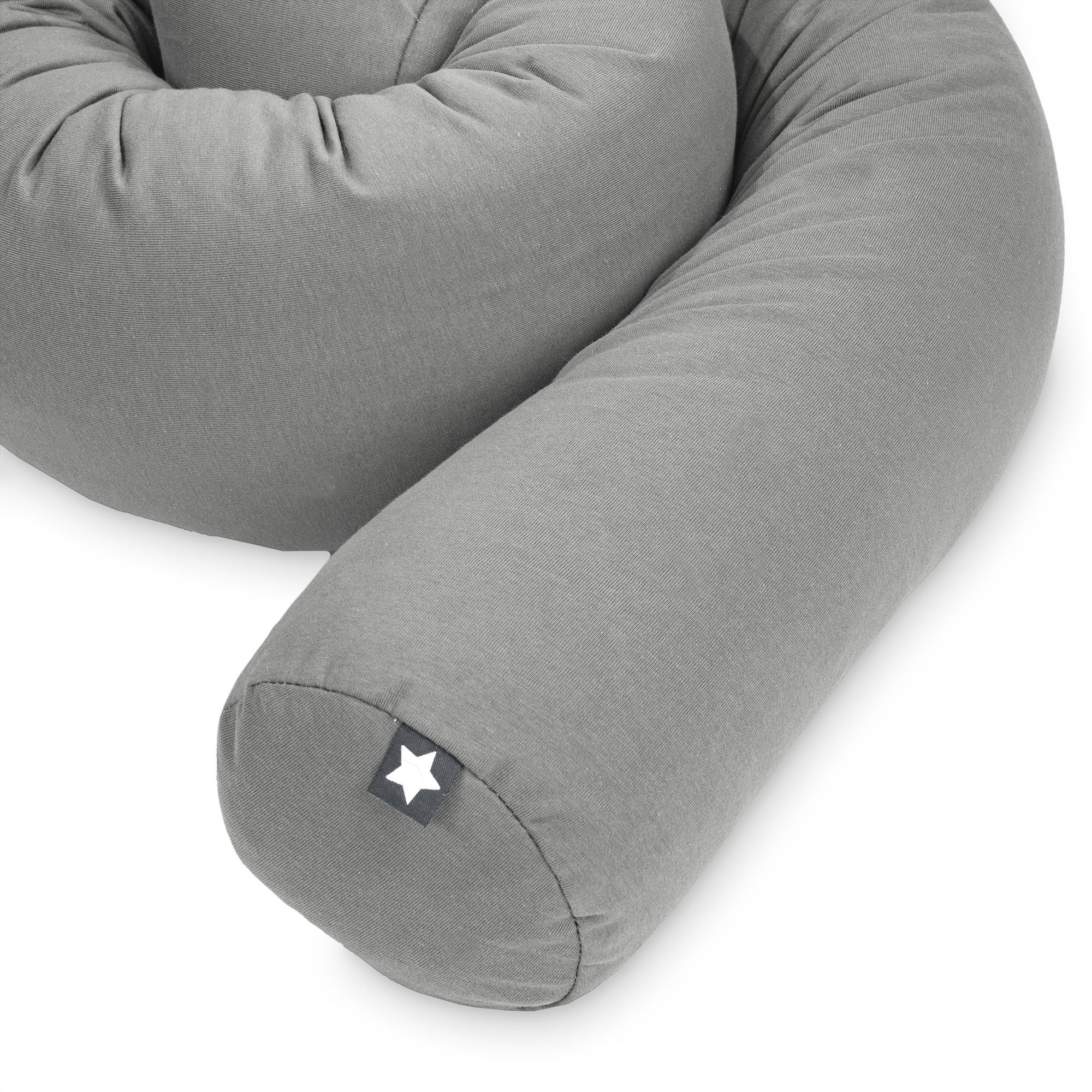 Unsere Bettschlangen schützen das Babyköpfchen vor den harten Stäben am Kinderbett und vor Zugluft. Sie sind zudem ein schönes Accessoire zum Spielen und Kuscheln. Das Nestchen besteht zu 100% aus Jersey-Baumwolle. Die Füllung ist aus Hohlfasern-Flocken (100%) Polyester). Das Nestchen ist für Kinderbetten mit dem Maßen 70x140 und 60x120 geeignet. Das Nestchen ist in der Waschmaschine im Schonwaschgang bei 40°C waschbar.