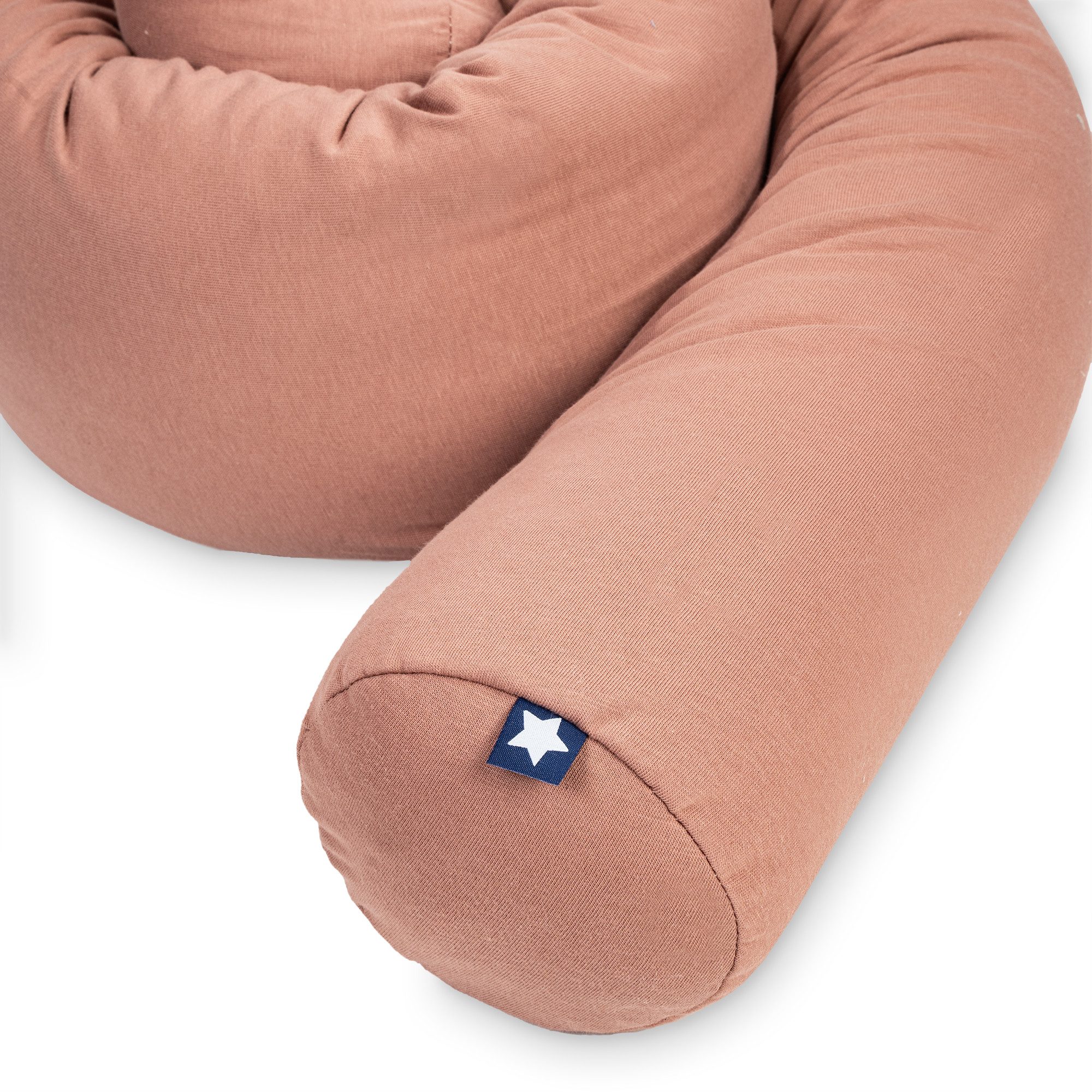 Unsere Bettschlangen schützen das Babyköpfchen vor den harten Stäben am Kinderbett und vor Zugluft. Sie sind zudem ein schönes Accessoire zum Spielen und Kuscheln. Das Nestchen besteht zu 100% aus Jersey-Baumwolle. Die Füllung ist aus Hohlfasern-Flocken (100%) Polyester). Das Nestchen ist für Kinderbetten mit dem Maßen 70x140 und 60x120 geeignet. Das Nestchen ist in der Waschmaschine im Schonwaschgang bei 40°C waschbar.