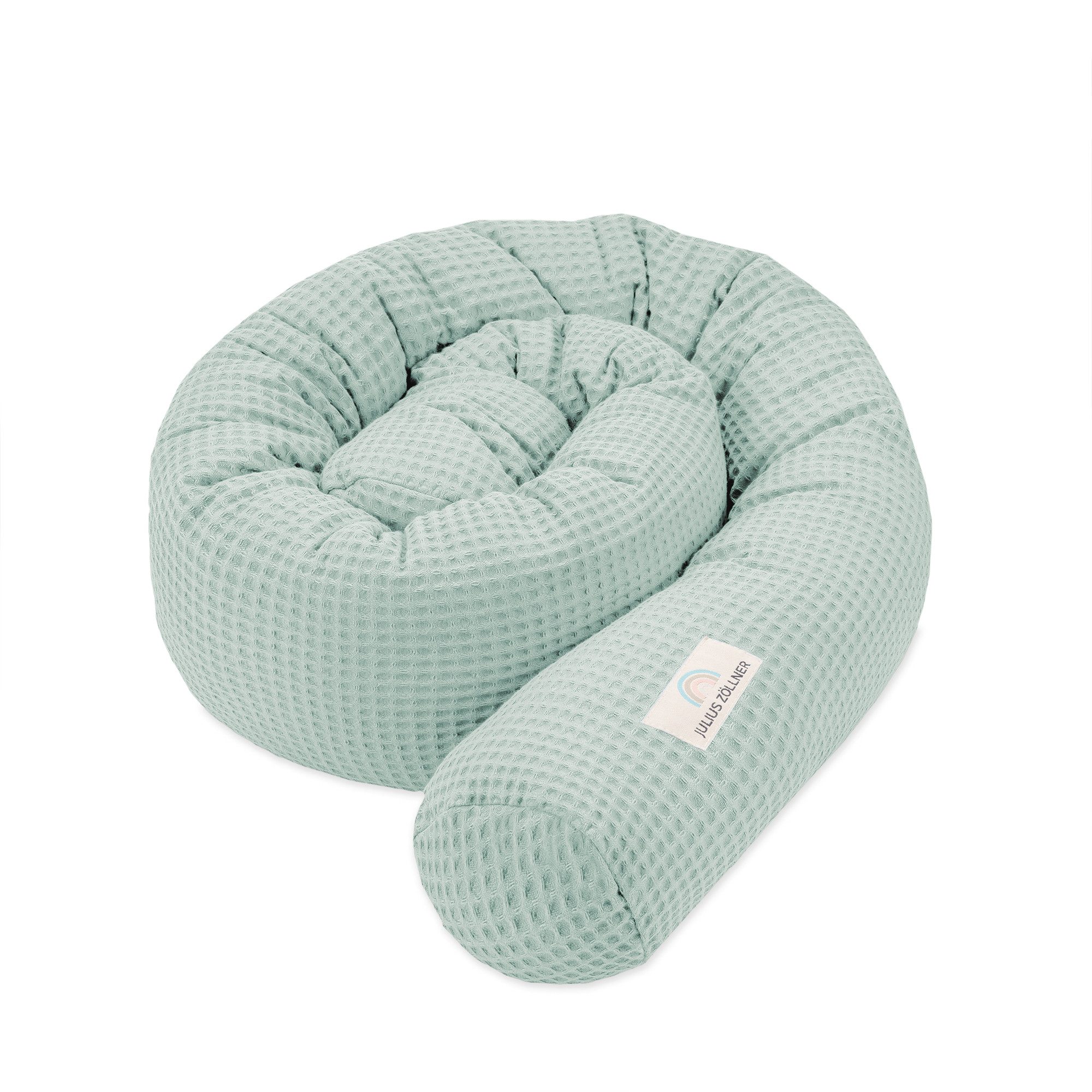 Unsere Bettschlangen schützen das Babyköpfchen vor den harten Stäben am Kinderbett und vor Zugluft. Sie sind zudem ein schönes Accessoire zum Spielen und Kuscheln. Das Nestchen besteht zu 100% aus Baumwolle. Die Füllung ist aus Hohlfasern-Flocken (100%) Polyester). Das Nestchen ist für Kinderbetten mit dem Maßen 70x140 und 60x120 geeignet. Das Nestchen ist in der Waschmaschine im Schonwaschgang bei 40°C waschbar.