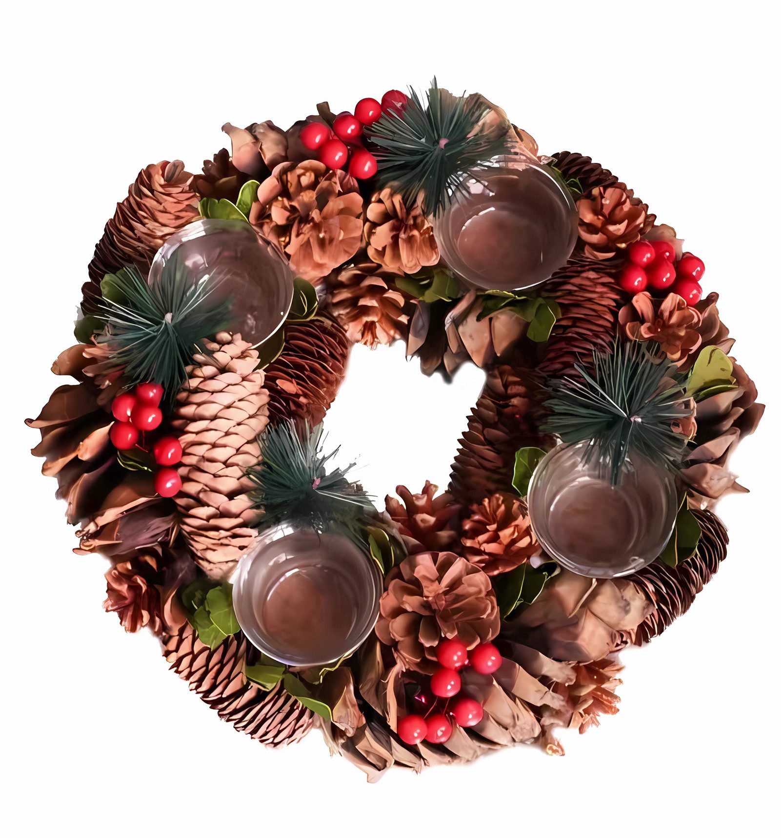 Hinweis Lieferumfang | 1 Holzkranz (mit 4 Kerzenhaltern aus Glas und 1 Heißklebestift, Kerze nicht enthalten) |