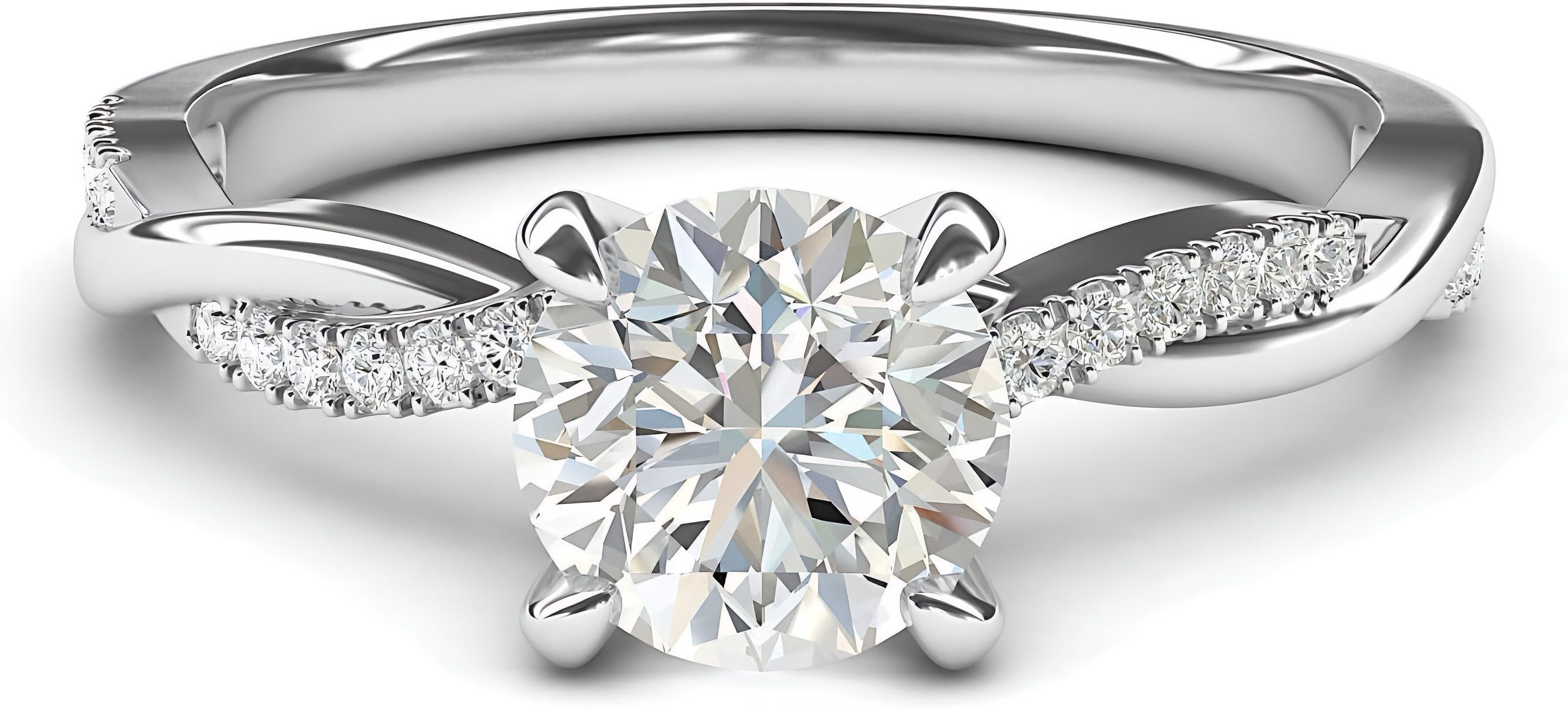 Der spezielle, gedrehte Bandschenkel ist 2,5 mm breit. Die Seiten sind mit insgesamt 22 Steinen besetzt. Все Steine in diesem Ring sind im Labor gezüchtete Diamanten.