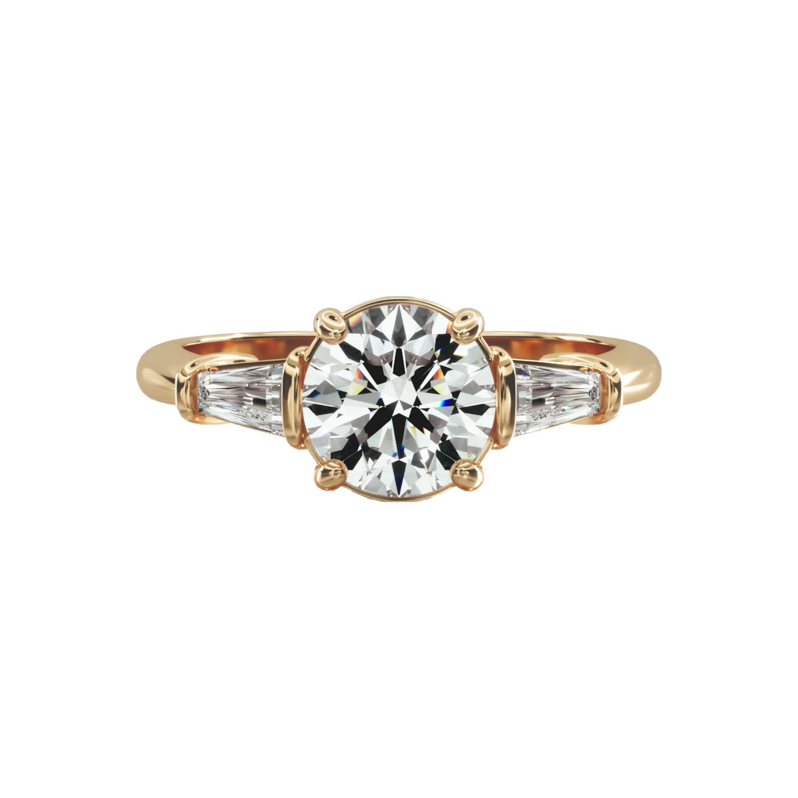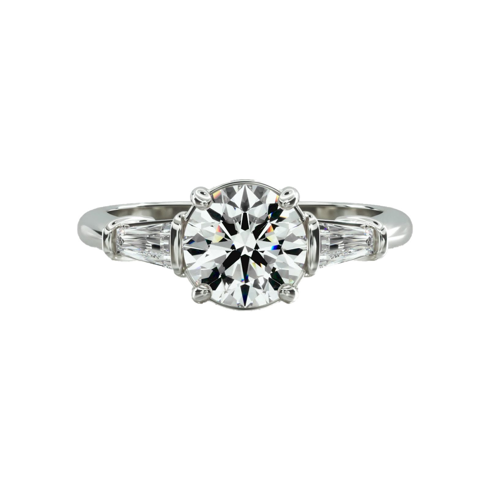 Design: Dieser klassische Ring verfügt über einen 1-Karat-Diamanten in der Mitte, der von konischen Baguettes flankiert wird, wodurch sein Design über Jahre hinweg Bestand hat.