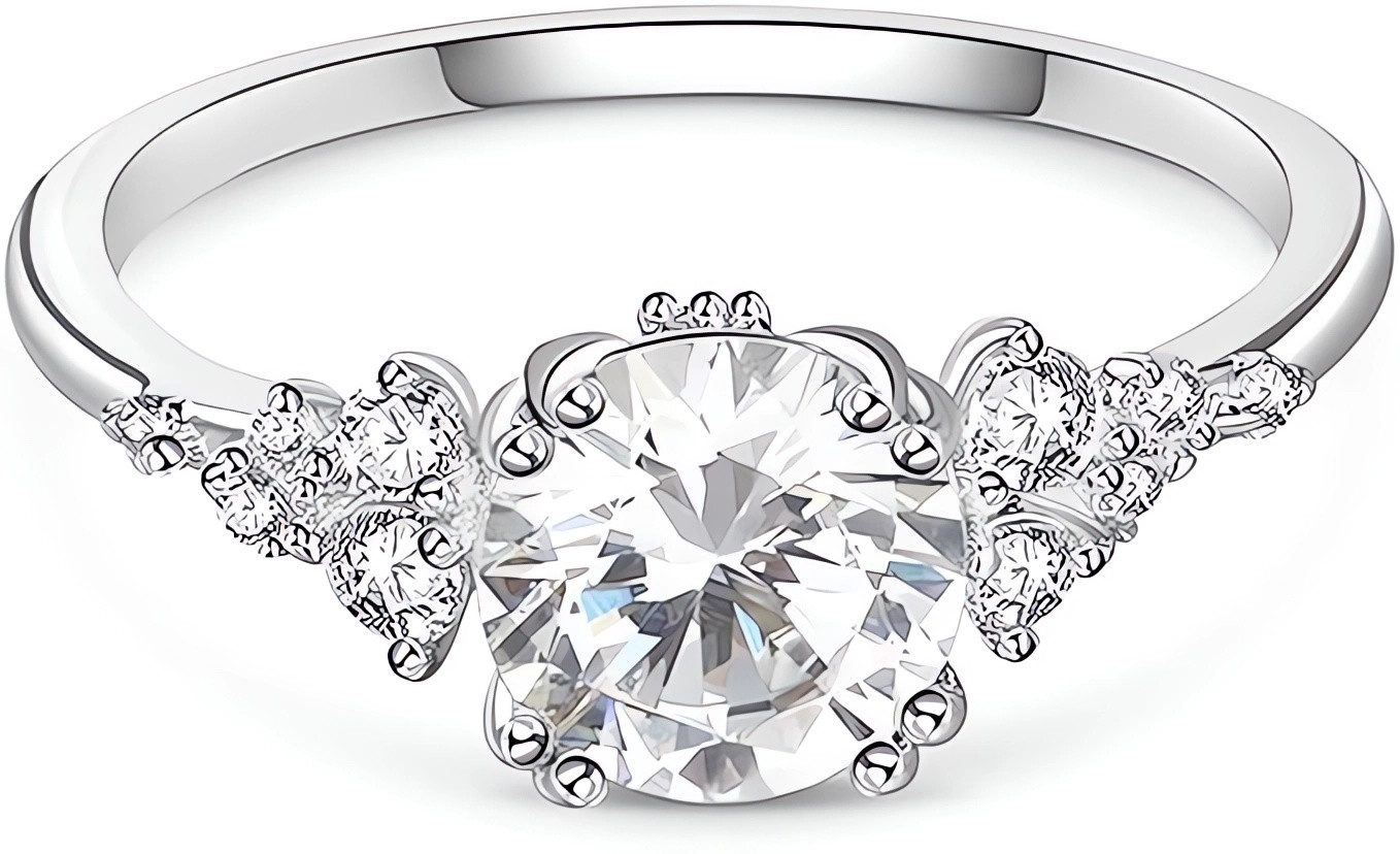 Dieser Ring verfügt über einen klassischen rundgeschliffenen Hauptdiamanten und kleine Diamanten an beiden Seiten des Ringbandes, die wie zwei lebhafte Schmetterlinge tanzen.