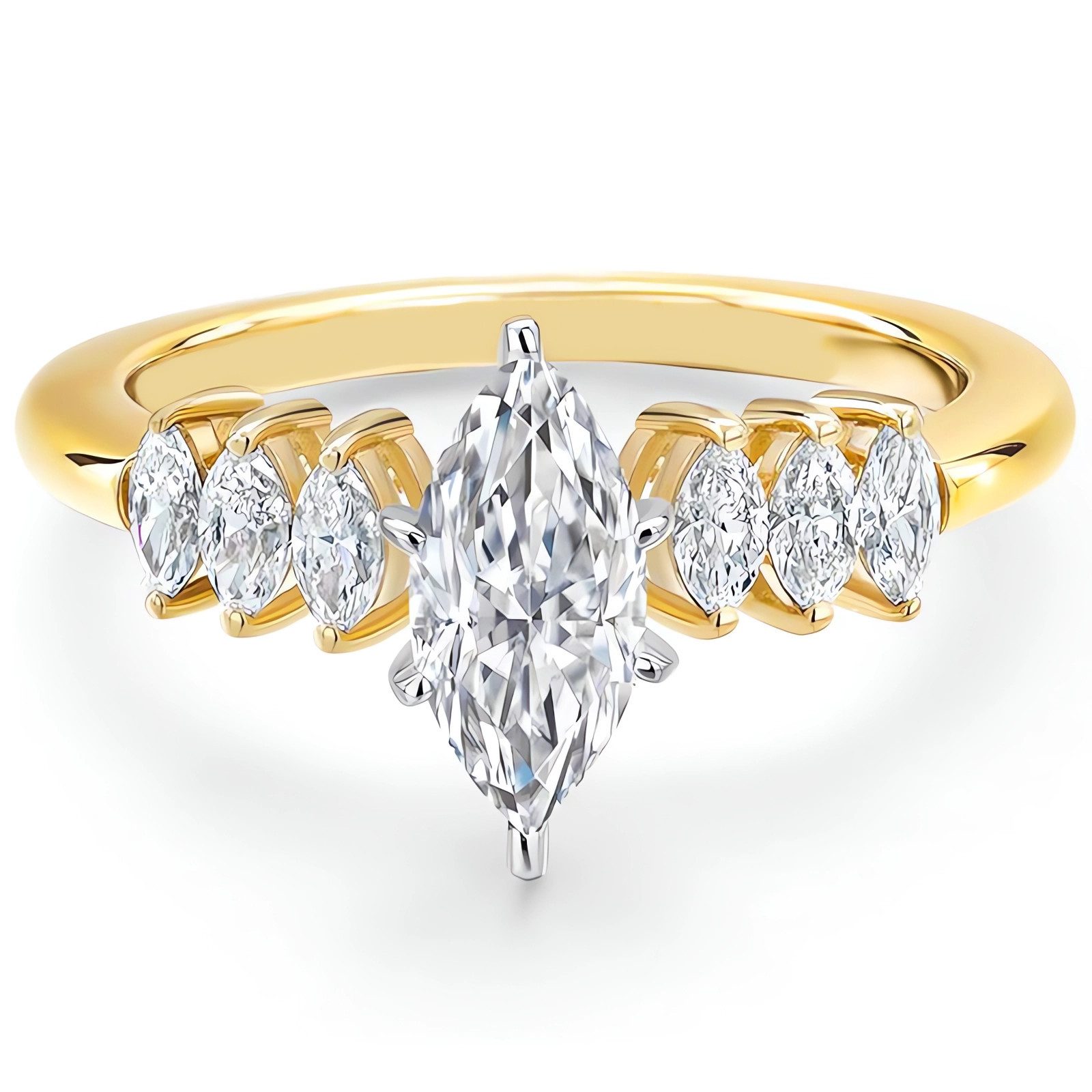 Durch die Anordnung der Marquise-Diamanten, Begleitsteine und die Form des Goldbands wirken die Finger länger und schlanker. Ein tolles Accessoire für eine verbesserte Hand - Optik