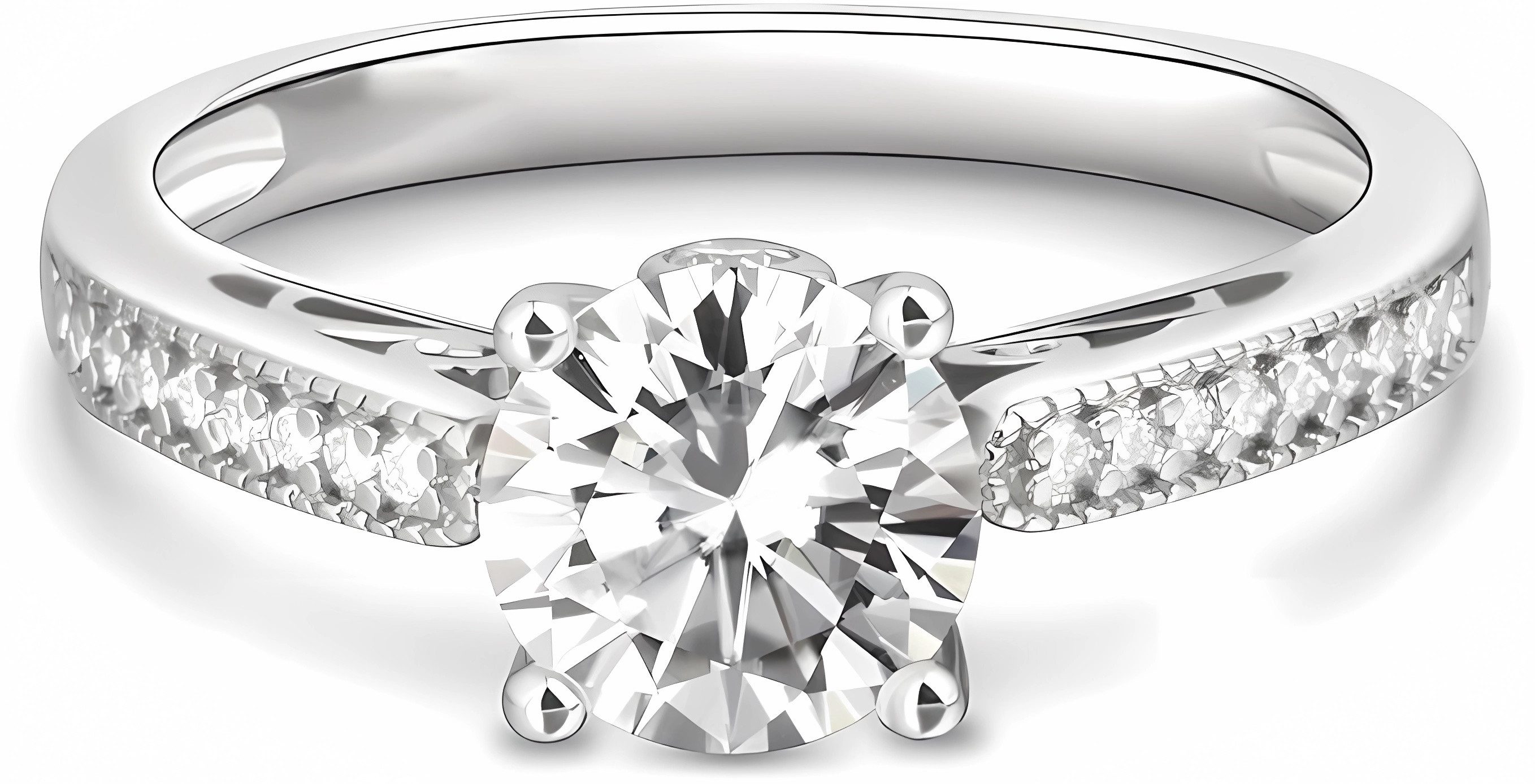 Der 1,2 ct große runde Hauptdiamant (Farbe E, VS2) mit IGI - Zertifikat ist auf beiden Seiten mit mehreren kleinen Diamantsteinen besetzt und leuchtet blendend.