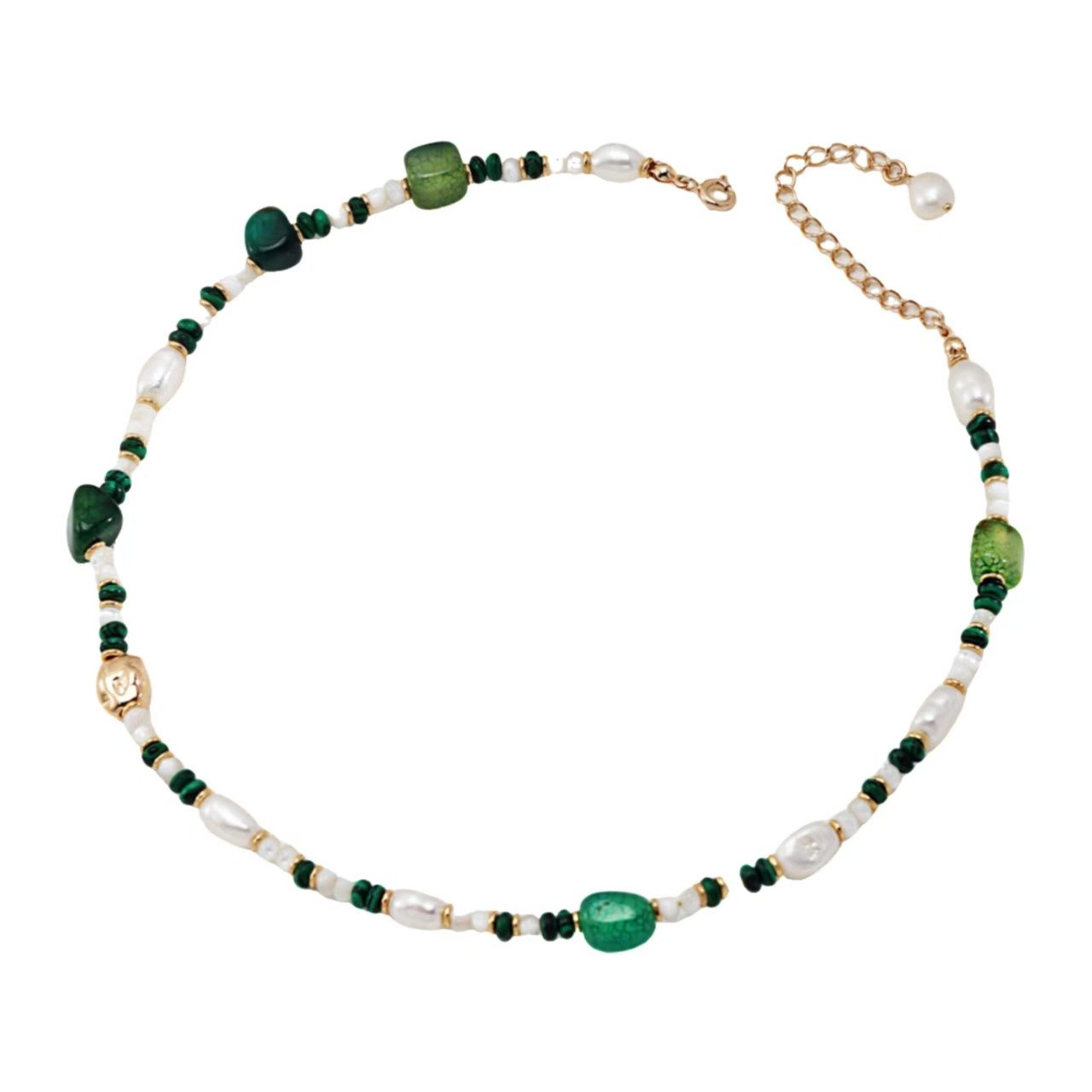 Design: Das zarte Weiß der Perlen und das Smaragdgrün des Malachits sind ineinander verschlungen und säumen die Halskette.