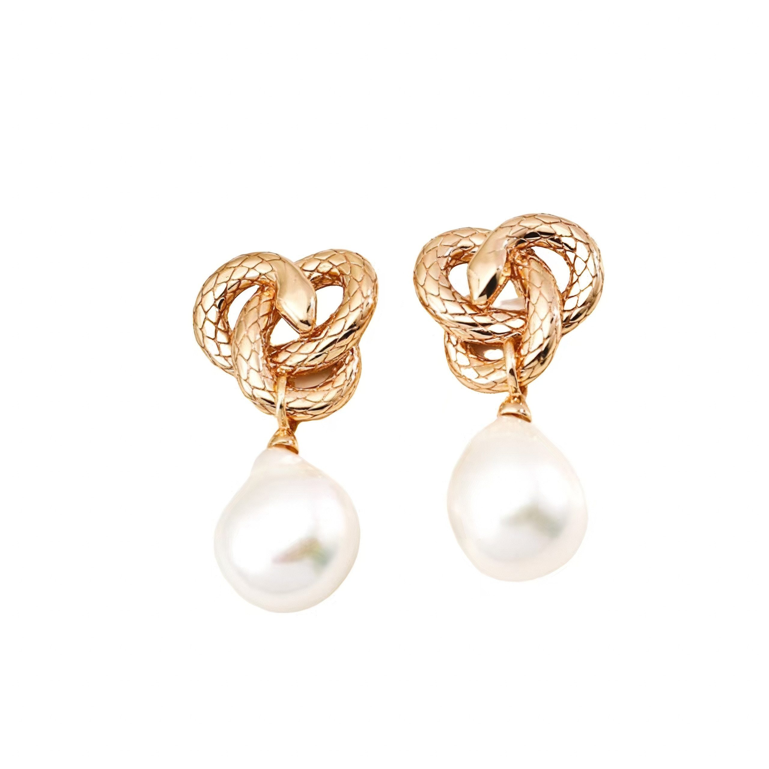 Designer-Ohrringe aus S925-Silber mit natürlichen Barockperlen und 18-karätig vergoldeten Totems aus Schlangengeistern, die mit eleganter Schärfe eingraviert sind.