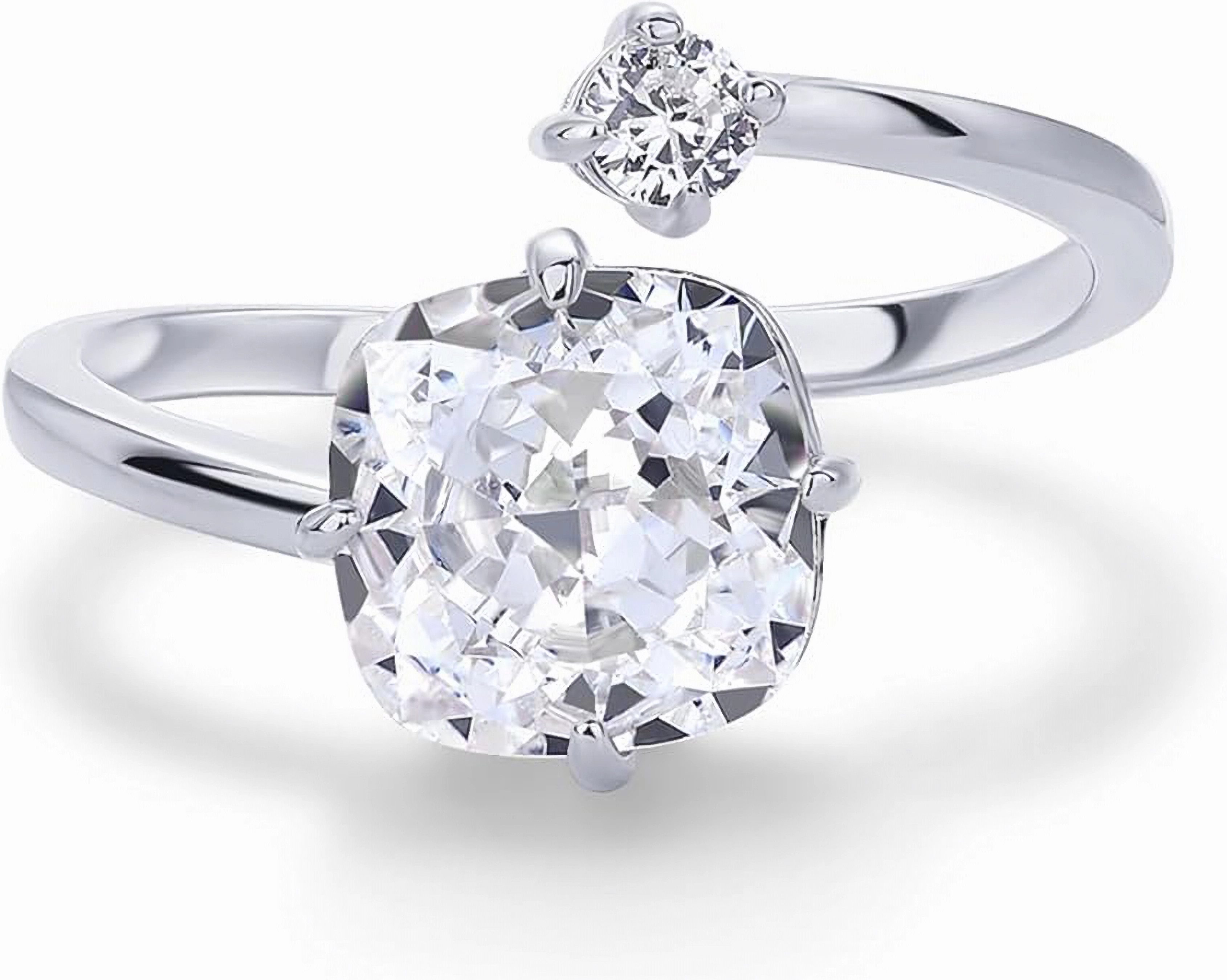Ein markanter Diamant im Kissenschliff mit 3 Karat als Mittelstein, akzentuiert durch kleinere Steine, sorgt für ein faszinierendes Design mit umwerfender Brillanz