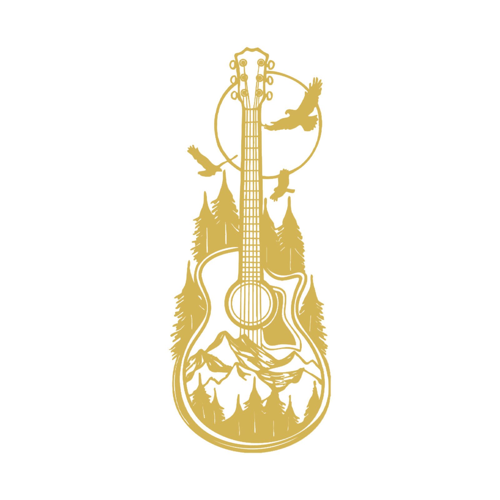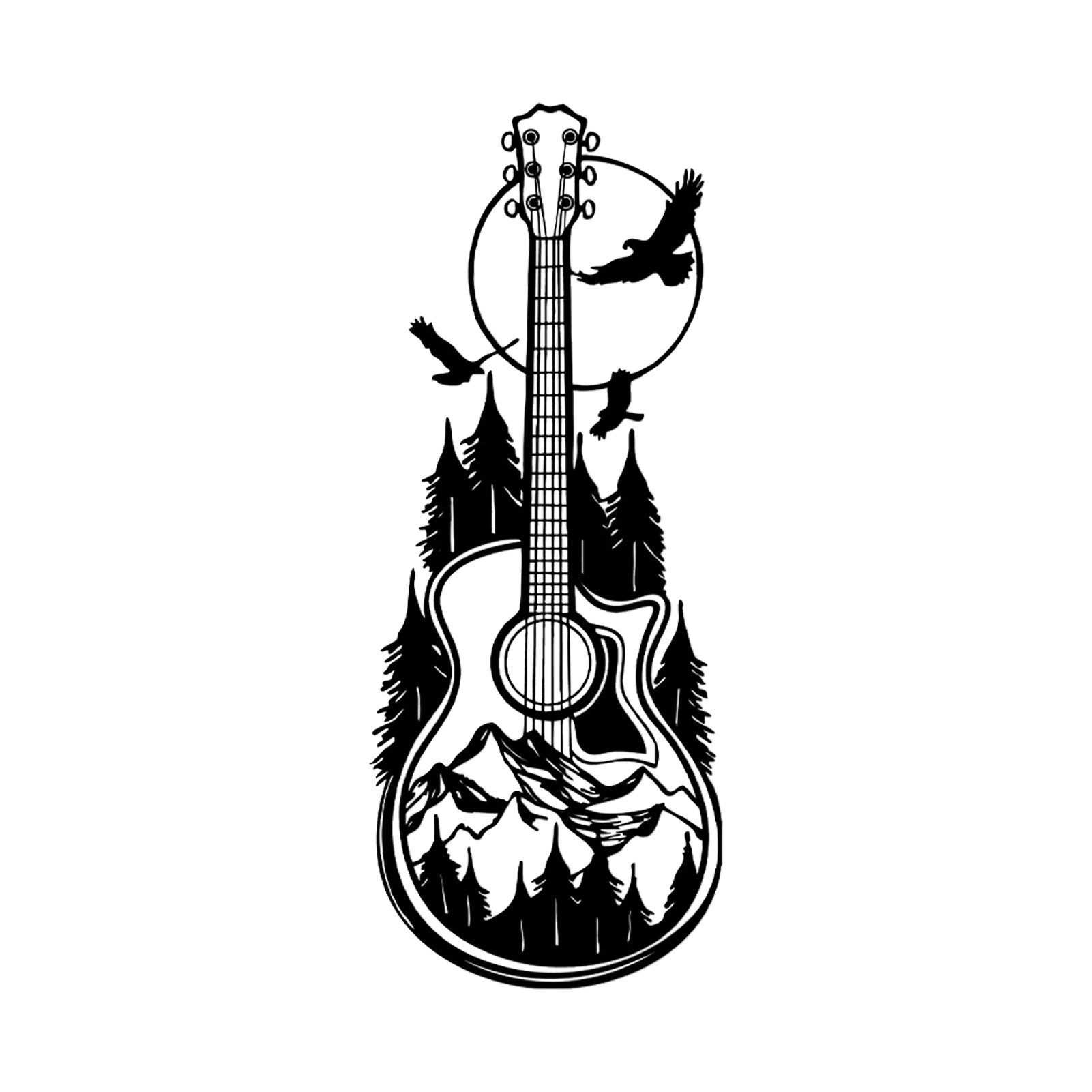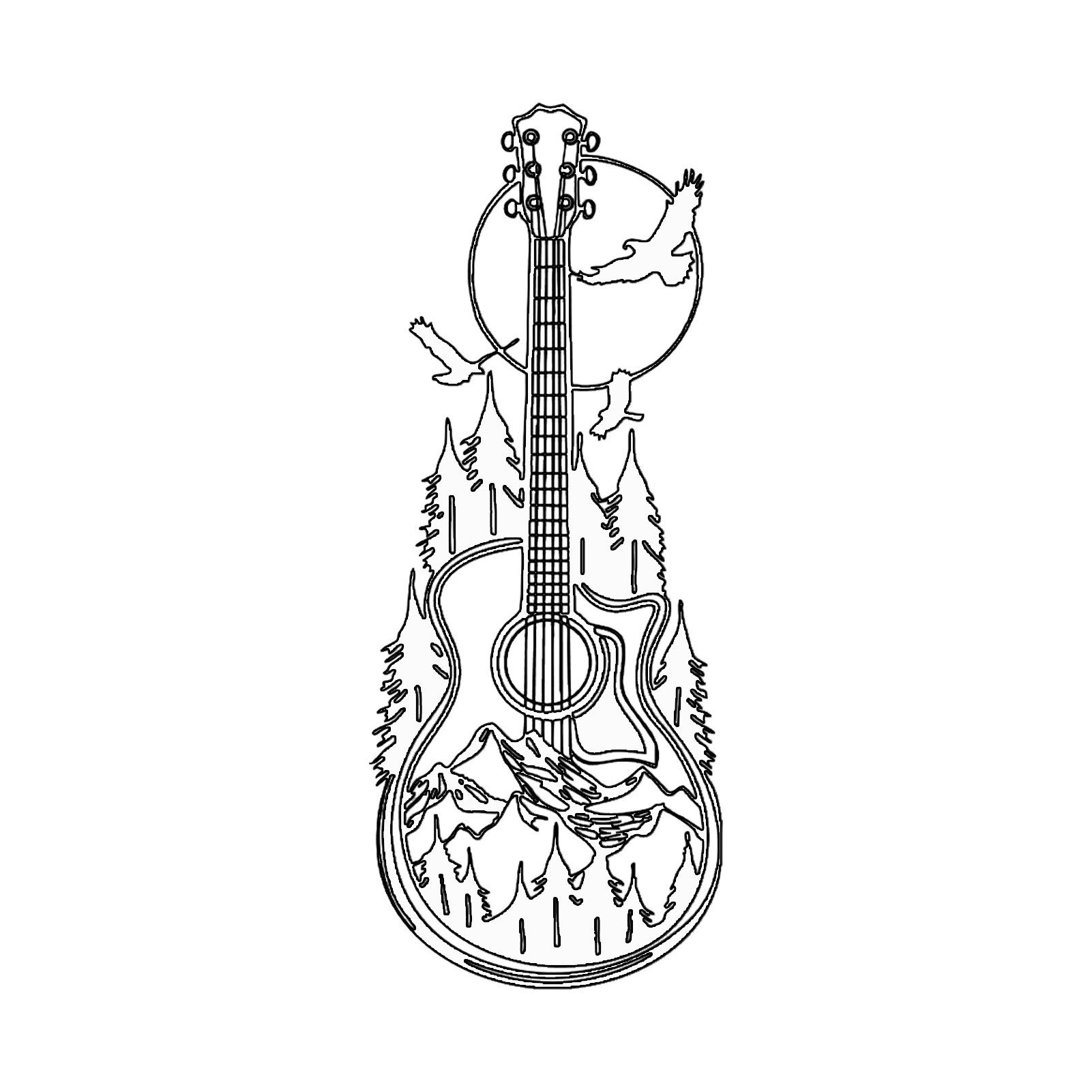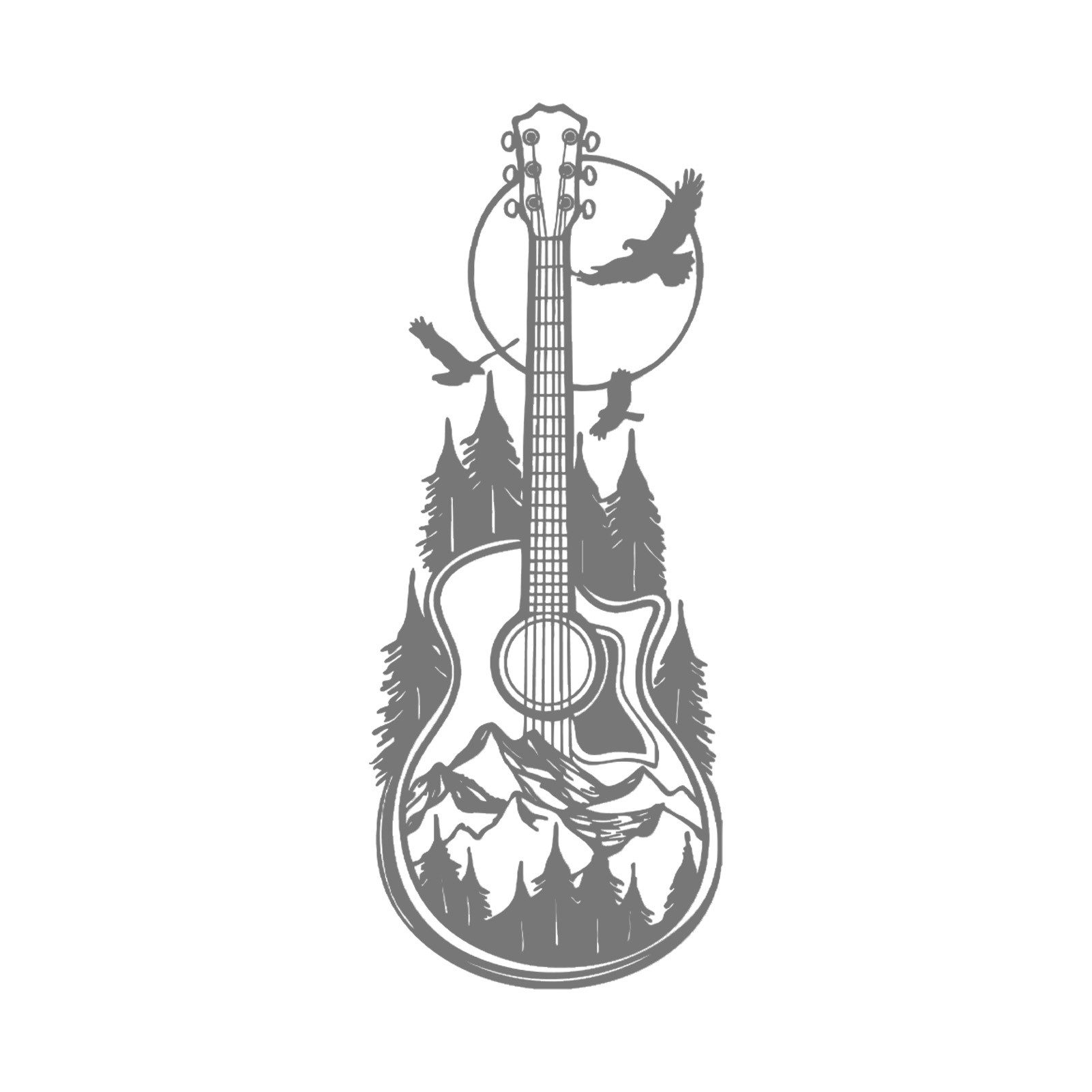 Set beinhaltet | Lieferumfang: 1 x Gitarre Metall Wanddekoration mit Bergvogel und Sonnenmotiv (inkl. Dehnschrauben). |
