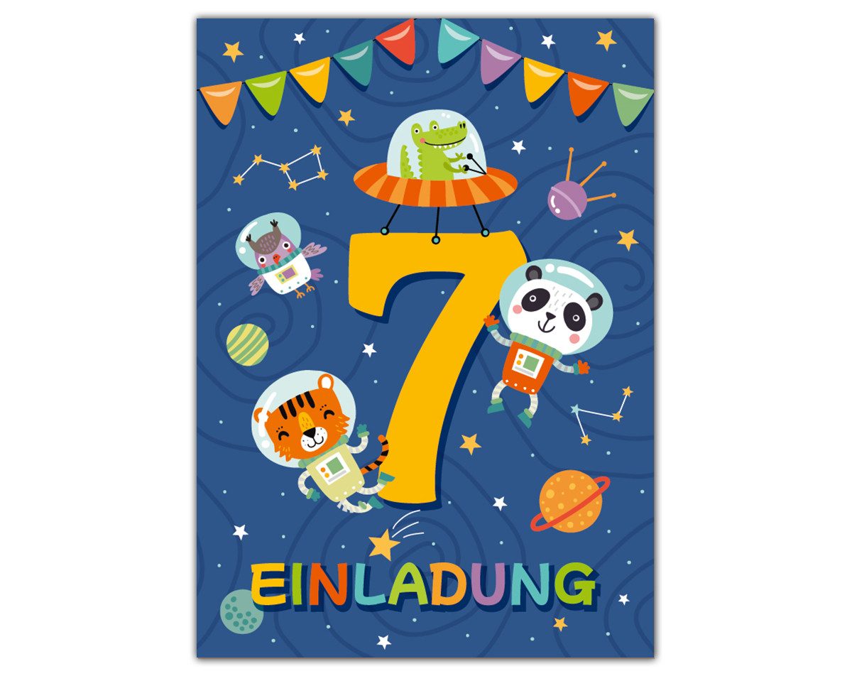 JUNAPACK Einladungskarten Astronaut Einladungen zum 7. Kindergeburtstag Jungen Karten Weltall, Einladungskarten mit Astronaut zum siebten Kindergeburtstag Tiere