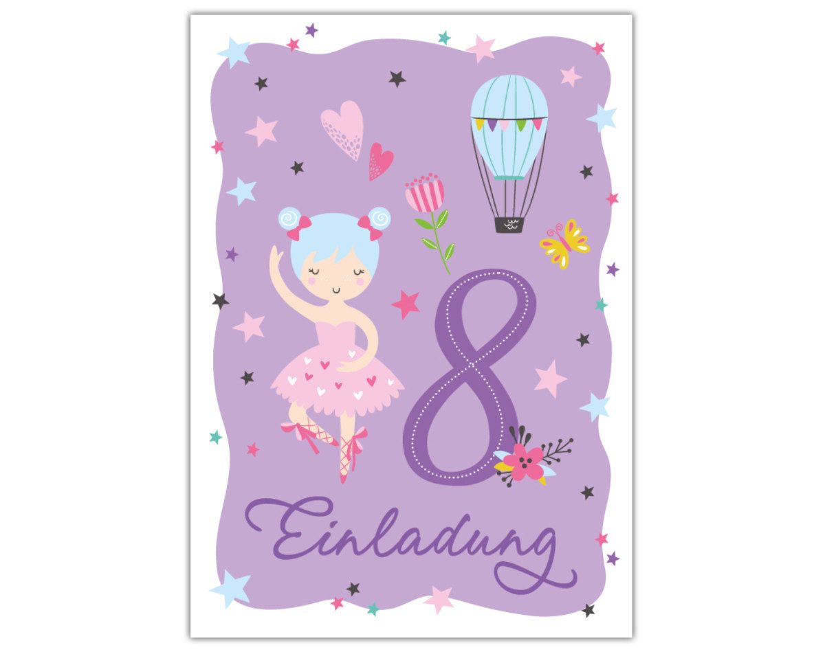 JUNAPACK Einladungskarten Ballerina Einladungen zum 8. Kindergeburtstag Ballett Karten Mädchen, Einladungskarten mit Ballerina lila zum achten Geburtstag Pferd