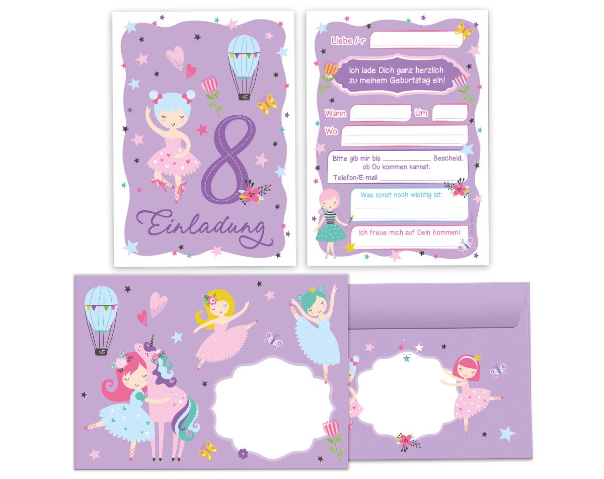 JUNAPACK Einladungskarten Ballerina zum 8. Kindergeburtstag Einladungen mit Umschlägen Karten, Einladungskarten mit Umschlägen zum achten Geburtstag Ballett lila