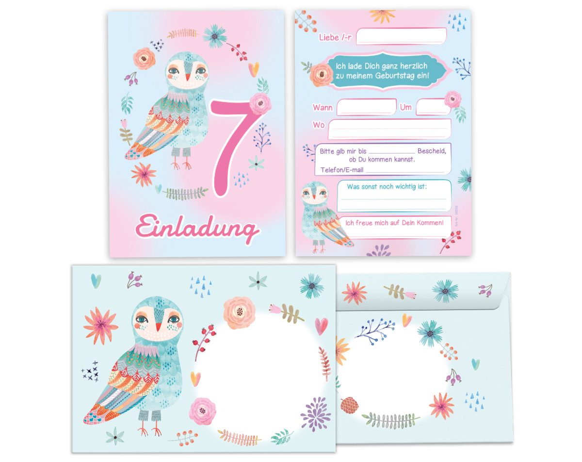 JUNAPACK Einladungskarten Eule zum 7. Kindergeburtstag Einladungen mit Umschlägen Karten Tiere, Einladungskarten mit Umschlägen zum siebten Kindergeburtstag Eule
