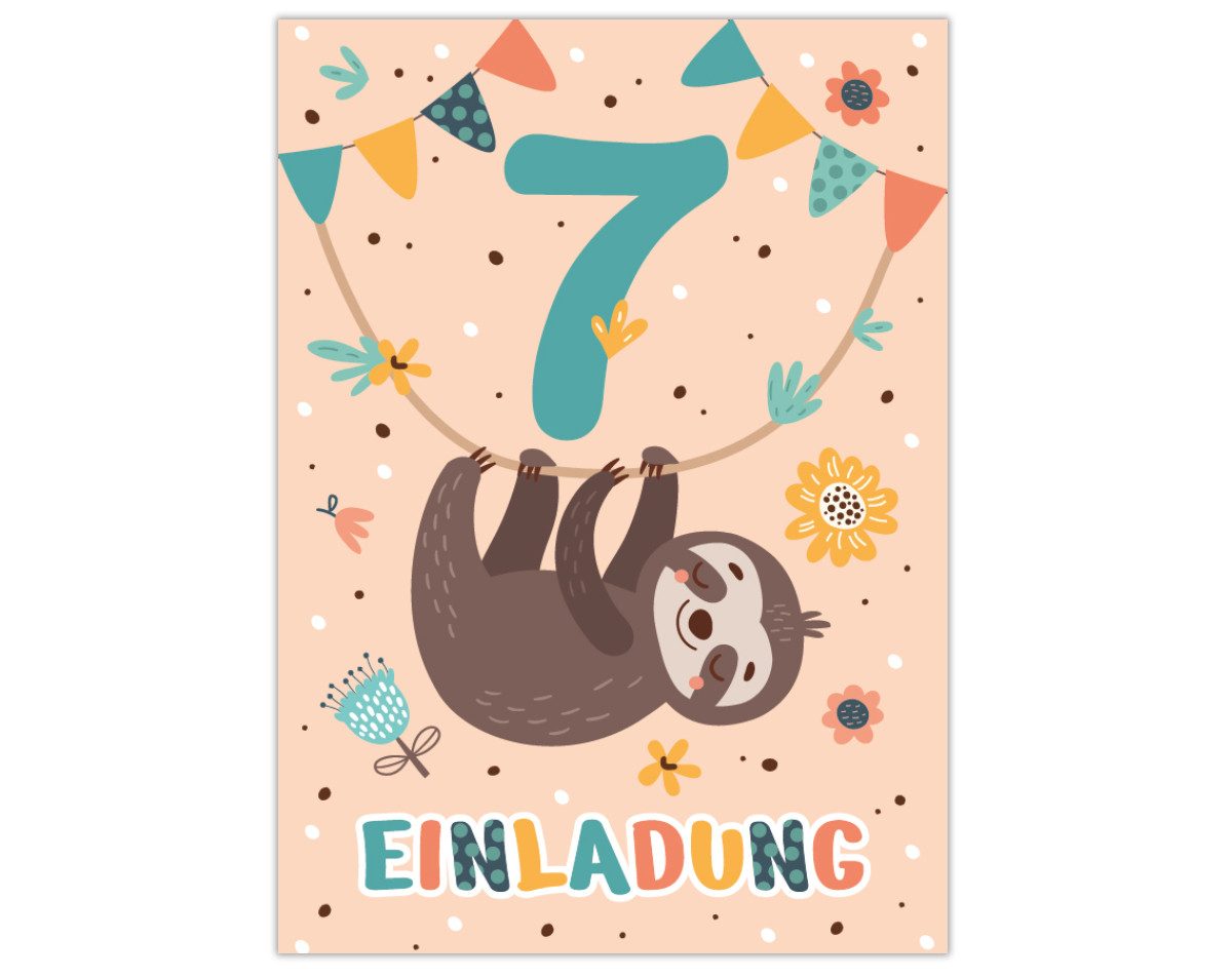 Einladungskarten zum 7. Geburtstag mit Faultier Motiv