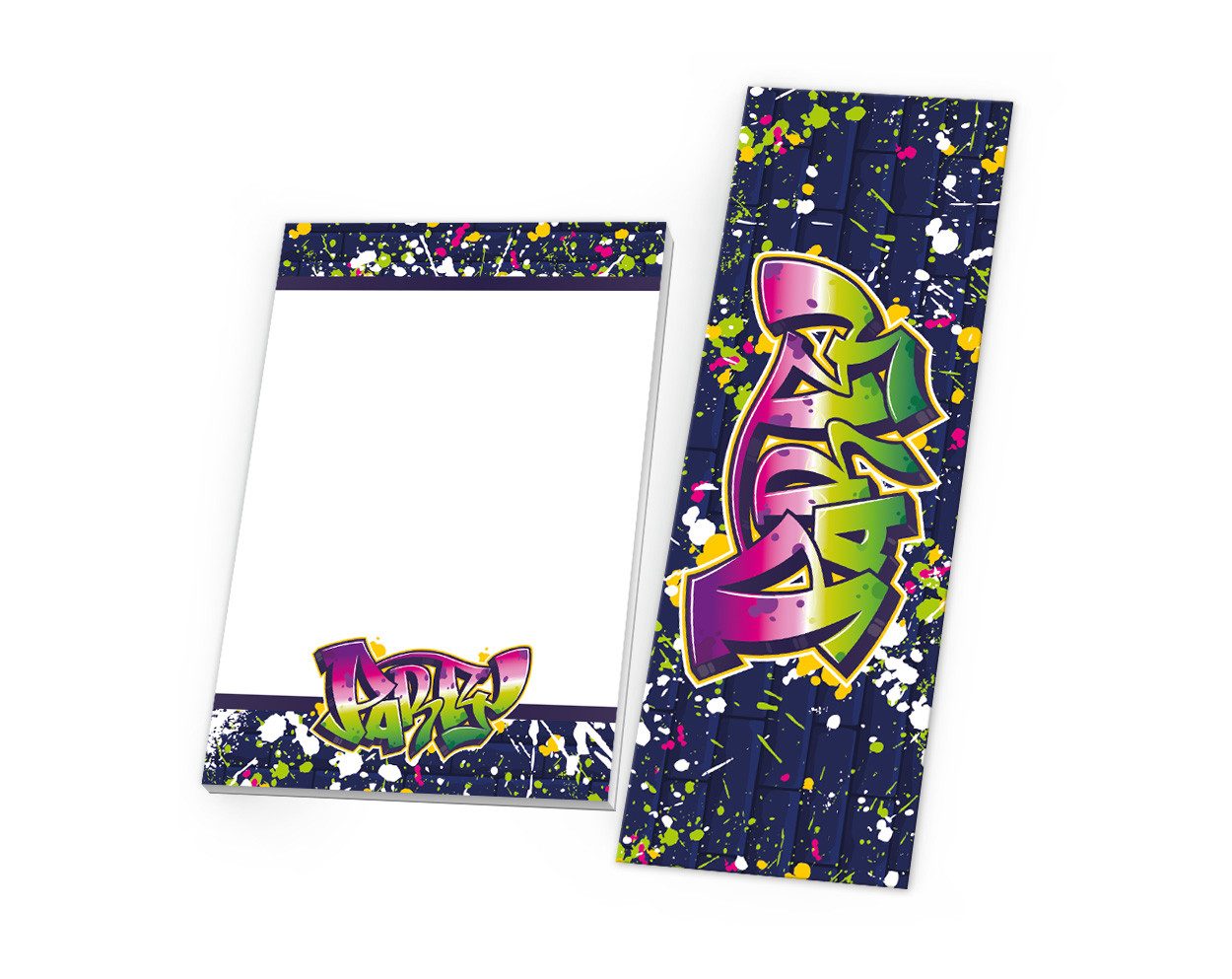 JUNAPACK Einladungskarten Graffiti Mitgebsel Mitbringsel Gastgeschenke Lesezeichen Blöcke A7, Graffiti Set für Kindergeburtstag – Lesezeichen & Mini-Notizblöcke