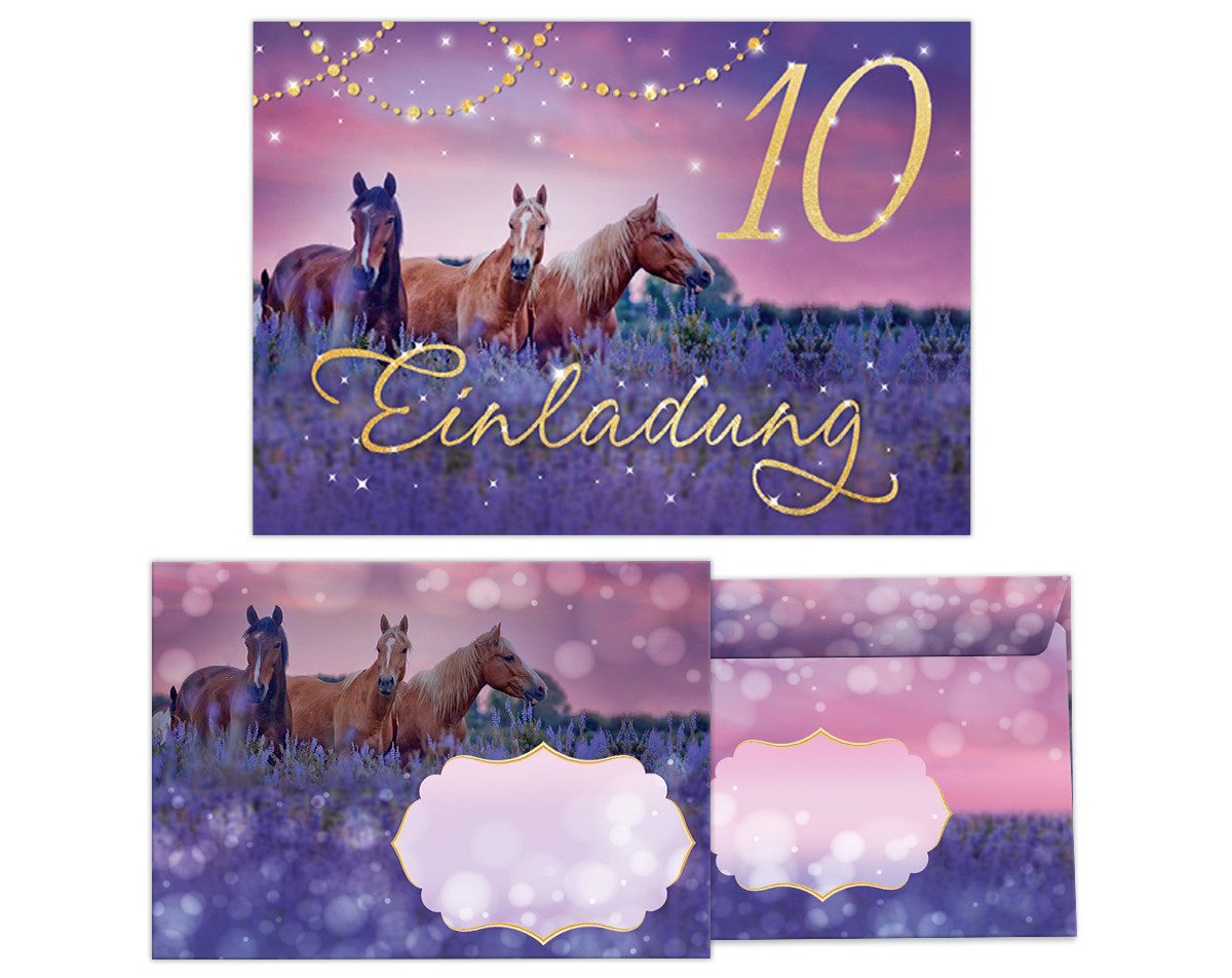 JUNAPACK Einladungskarten Pferd zum 10. Kindergeburtstag Mädchen Einladungen mit Umschlägen lila, Karten mit Umschlägen zum zehnten Geburtstag Pferd