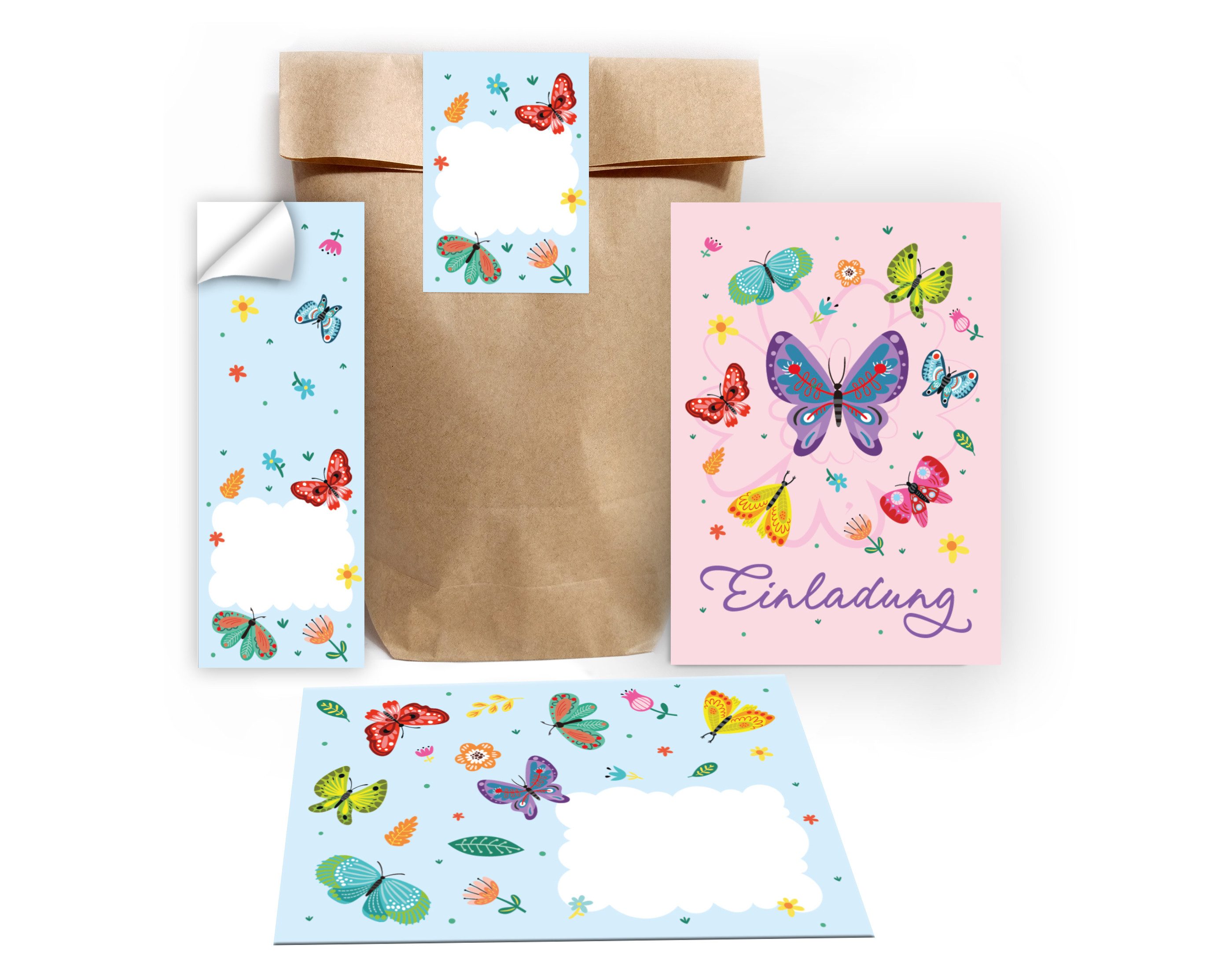 JUNAPACK Einladungskarten Schmetterling zum Geburtstag Einladungen mit Umschlägen Mitgebsel, Mitbringsel Set Schmetterlinge für Kinder zum Geburtstag Gastgeschenke