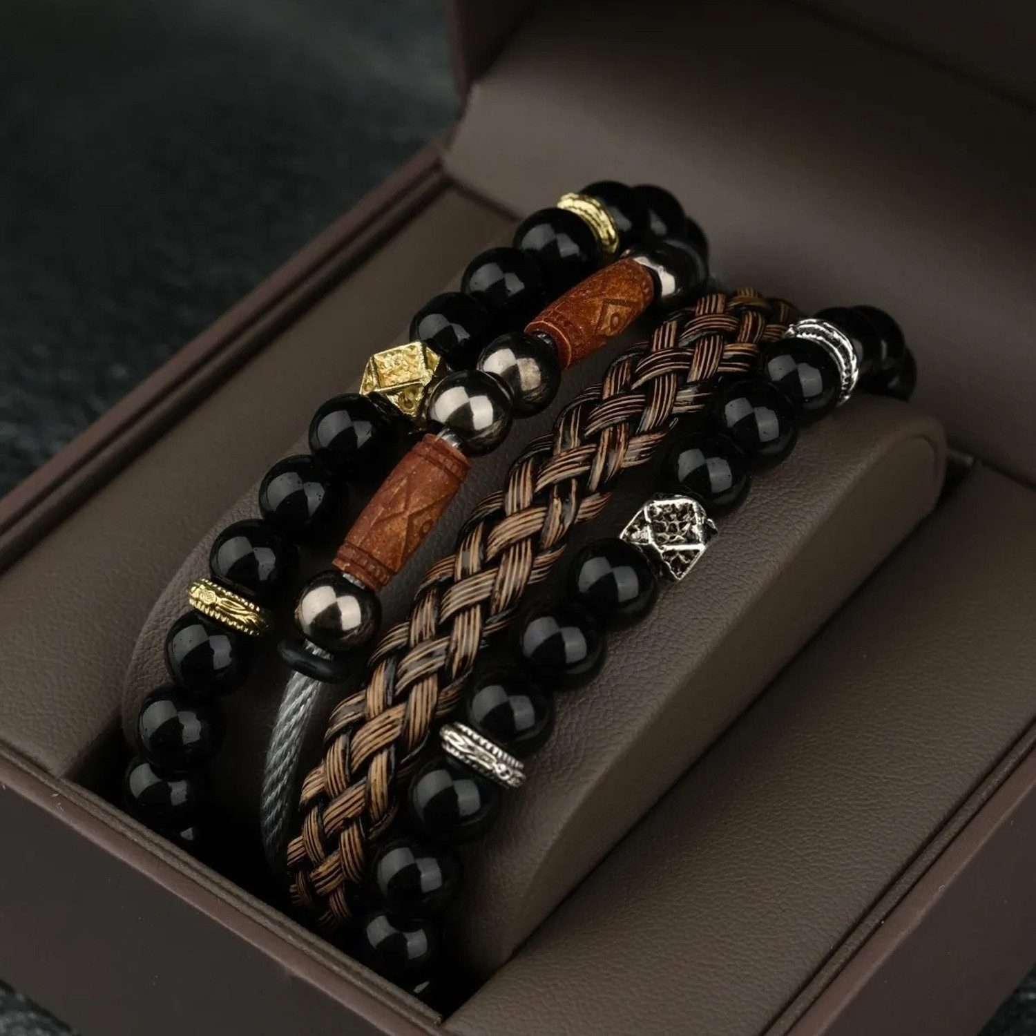 3-teiliges Herren-Armband-Set aus Naturstein, geflochtenem Leder und Metall, vielseitig kombinierbar für Alltag, Büro und besondere Anlässe.