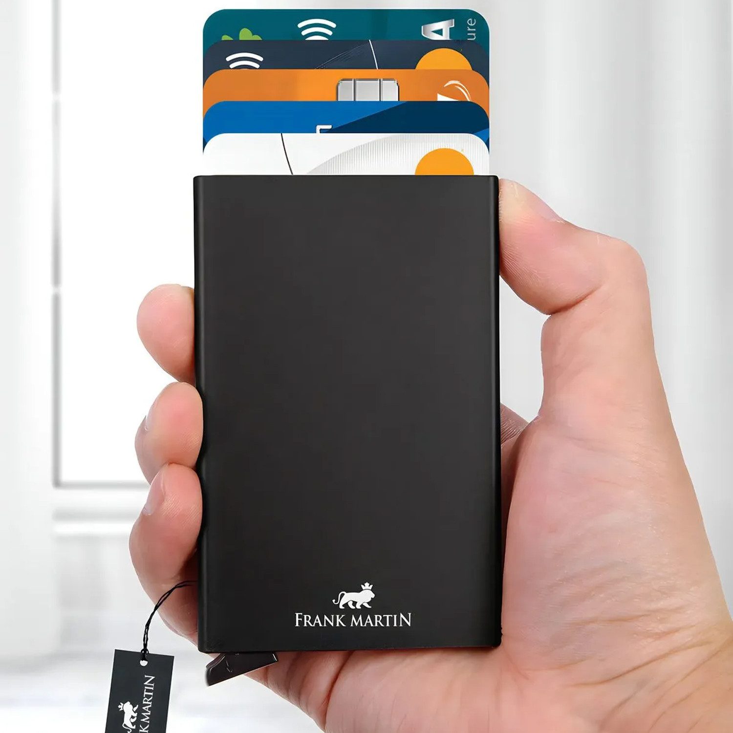Ausstattung | RFID-Schutz, Automatik-Kartenfach, 2 Außenfächer, Slim-Design, stabile Metallhülle, Geschenkbox |