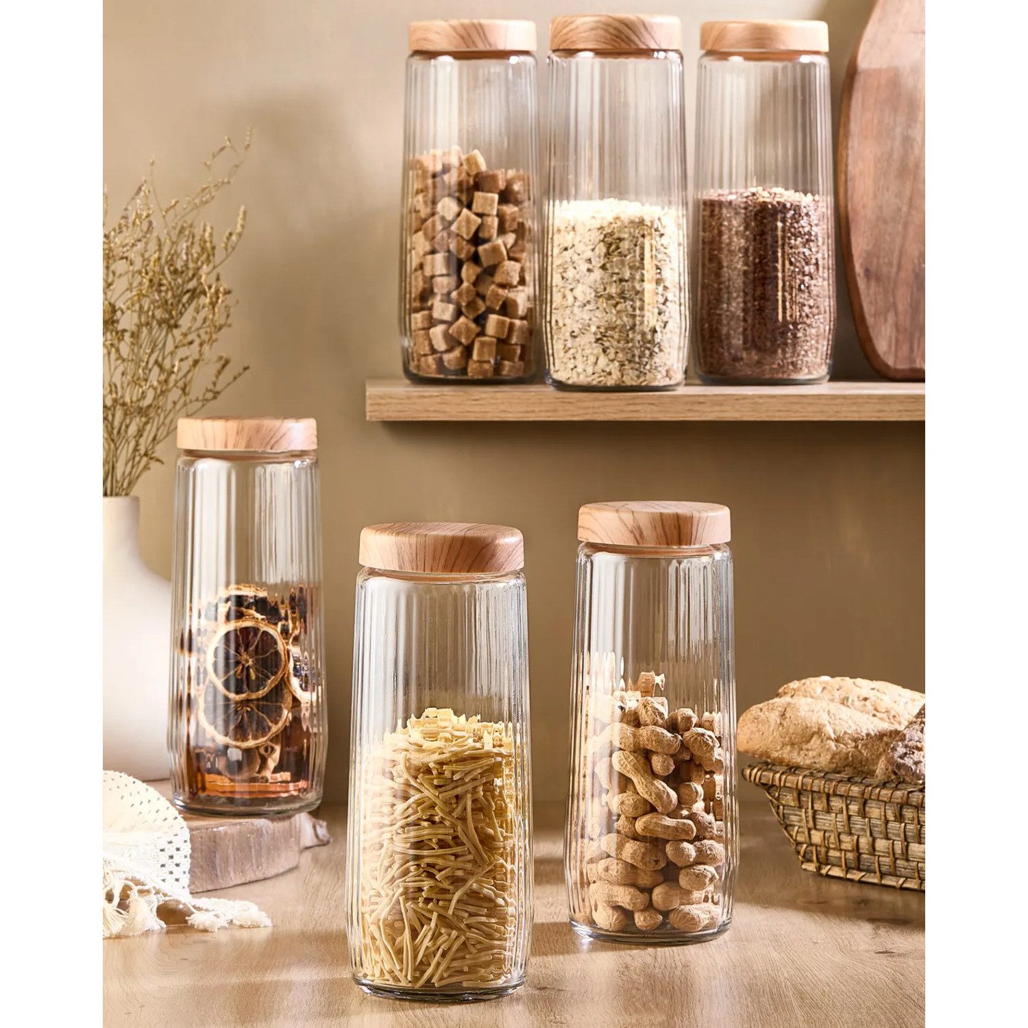 Ausstattung | Luftdichter Schraubdeckel in Bambus-Optik, gerilltes Glas |